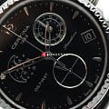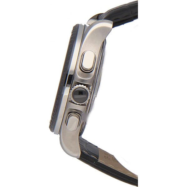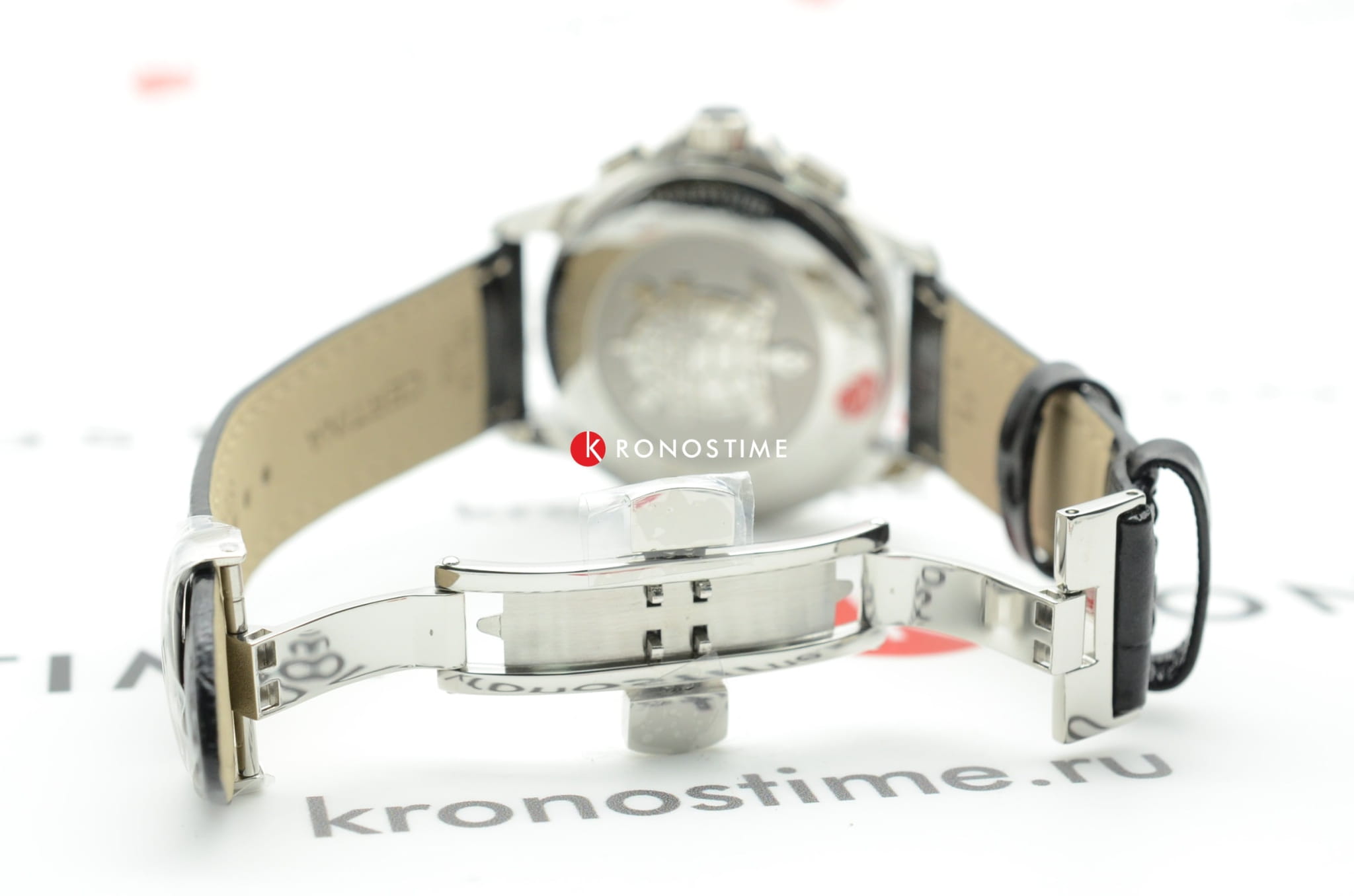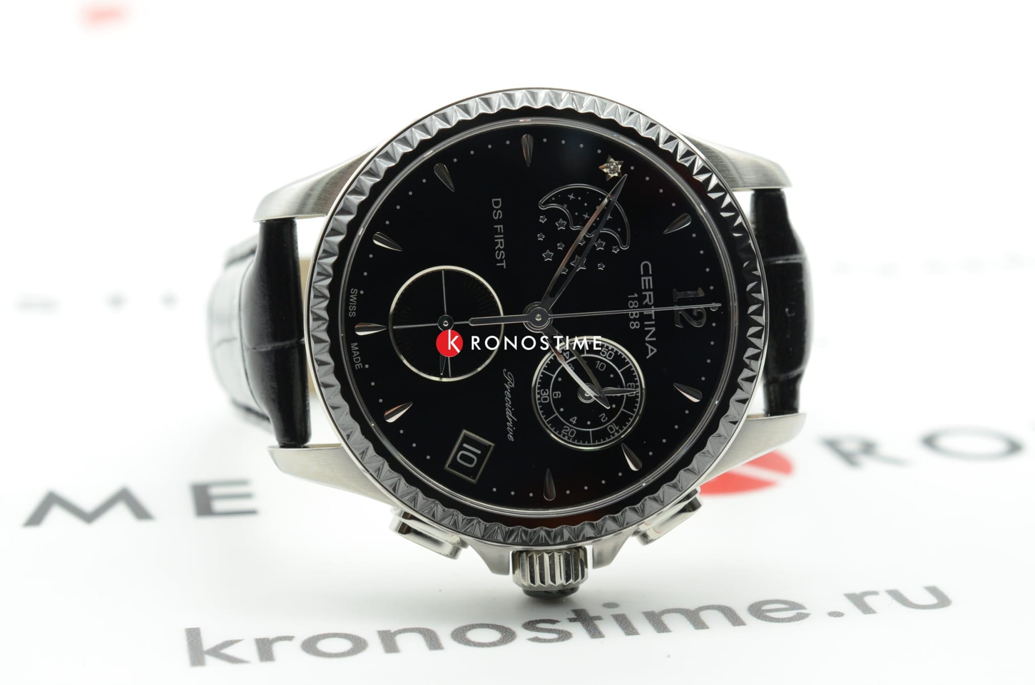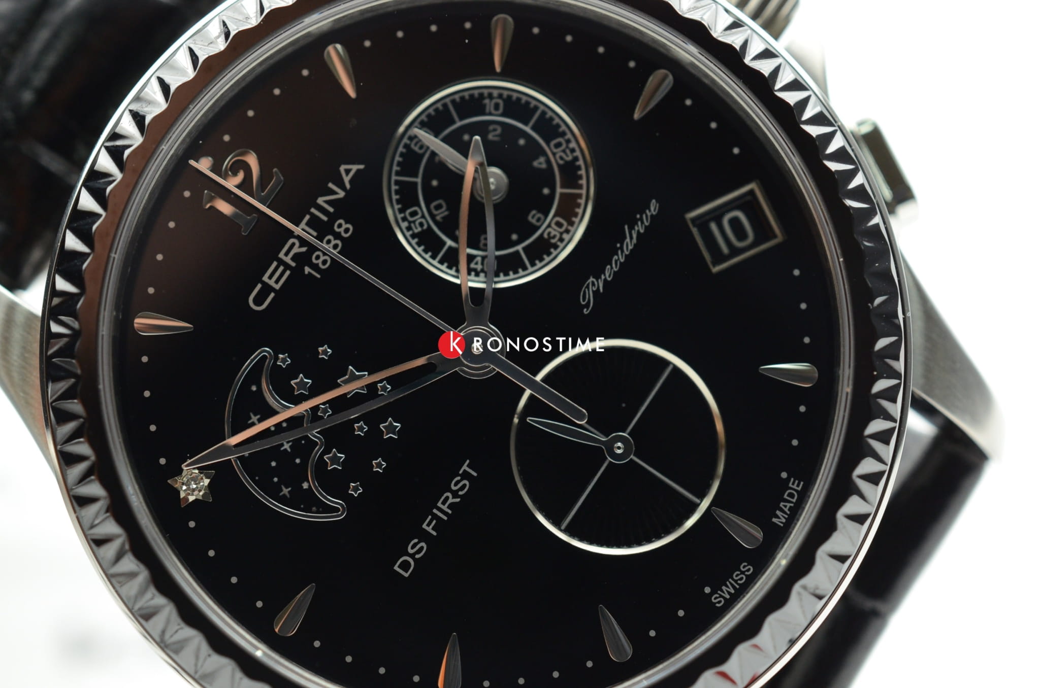 Окошко в положении 10 часов отображает лунные фазы, стильно смотрится бриллиантовая звезда. Кварцевый швейцарский механизм G10.962 Precidrive™Precidrive™Инновационный кварцевый механизм Certina. Часы, оснащённые этим швейцарским калибром, приравниваются к точности к сертифицированным хронометрам, точность хода составляет +/-10 секунд в год.. Керамический безельБезельВнешний ободок, закрепляющий стекло. В спортивных часах так называется поворотное кольцо с делениями на циферблате, выполняет роль таймера – замеряет отрезки времени на шкале. Неподвижный безель – элемент декора. Однонаправленно вращающийся безель на дайверских часах позволяет фиксировать моменты погружения и выныривания на поверхность. с гранёным краем. Чёрный кожаный ремешок. EOLEOLПредставляет собой систему, уведомляющую владельца часов о необходимости замены элемента питания. За 2 недели до полного разряда батарейки секундная стрелка перестаёт ходить чётко и начинает перепрыгивать на 3-4 деления., календарь, хронографХронографФункция позволяет измерять отрезки времени с особой точностью: часы, минуты, секунды. Верным признаком хронографа является наличие на циферблате 3 дополнительных окошек-счётчиков..