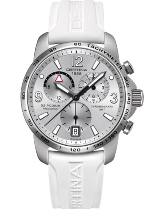 Модель обладает полезным функционалом: хронографХронографФункция позволяет измерять отрезки времени с особой точностью: часы, минуты, секунды. Верным признаком хронографа является наличие на циферблате 3 дополнительных окошек-счётчиков., секундомер, GMTGMTОтображение времени второго часового пояса.Такая функция особенно актуальна для путешественников и бизнесменов,которые общаются с людьми из разных стран,теперь вы всегда будете знать,какой час у вашего партнёра или близкого человека., календарь, тахиметрТахиметрРазмеченная шкала, располагается на ободке или безеле часов. Тахиметр позволяет рассчитать скорость на определённом участке пути, расстояние измеряется в километрах или милях.. Швейцарский кварцевый калибр G10.962 BF Precidrive™Precidrive™Инновационный кварцевый механизм Certina. Часы, оснащённые этим швейцарским калибром, приравниваются к точности к сертифицированным хронометрам, точность хода составляет +/-10 секунд в год.. Сверхлёгкий алюминиевый корпус. Каучуковый ремешок. Сапфировое стекло. Люминесцентная подсветкаЛюминесцентное покрытиеПозволяет считывать показания времени в темноте. Производители наносят на стрелки, часовые индексы, безель или поверхность циферблата светонакопительный состав, дающий холодное свечение..