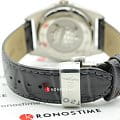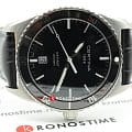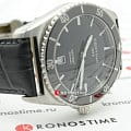 Стальной корпус оснащён чёрным керамическим безелемБезельВнешний ободок, закрепляющий стекло. В спортивных часах так называется поворотное кольцо с делениями на циферблате, выполняет роль таймера – замеряет отрезки времени на шкале. Неподвижный безель – элемент декора. Однонаправленно вращающийся безель на дайверских часах позволяет фиксировать моменты погружения и выныривания на поверхность., устойчивым к царапинам. Сапфировое стекло дополнено покрытием «антиблик». Швейцарский кварцевый механизм ETA 955.112 отличается высокой точностью хода. Кожаный ремешок надёжно обхватывает запястье.