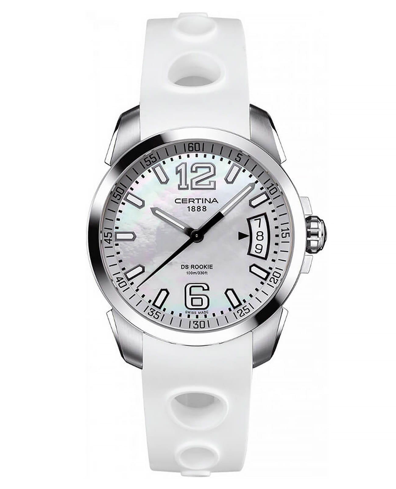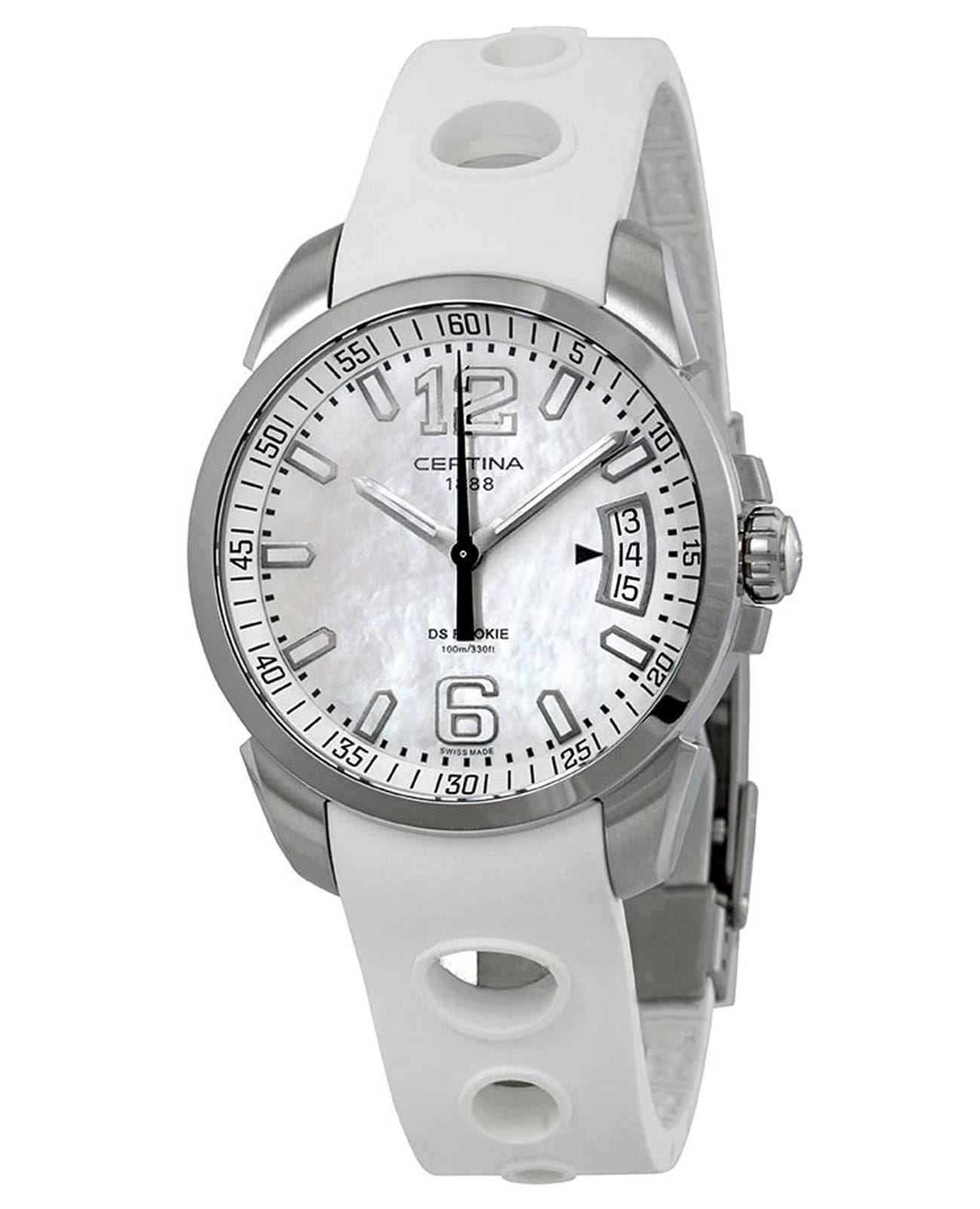 Крупные контрастные элементы, расположенные на белом циферблате, обеспечивают идеальную читаемость данных вне зависимости от условий видимости. Часы комплектуются швейцарским кварцевым механизмом ETA F07.111, демонстрирующим безупречную точность хода. Система Двойной Надёжности DS ConceptDS ConceptDouble Security Concept, обозначает двойную надёжность и безупречную точность часов Certina. Двойная система защиты подразумевает обеспечение максимальной устойчивости к ударам и высоких показателей водонепроницаемости.. Ударопрочный корпусУдаропрочный корпусМеханизм заключён в корпус, выполненный из современных материалов, устойчивых к ударам, механическим повреждениям и падению с высоты: инновационный пластик, карбон, нержавеющая сталь, титан. и браслет из хирургической стали 316L, устойчивой к коррозии. Люминесцентная подсветкаЛюминесцентное покрытиеПозволяет считывать показания времени в темноте. Производители наносят на стрелки, часовые индексы, безель или поверхность циферблата светонакопительный состав, дающий холодное свечение.. Степень водостойкости WR 100. Застёжка бабочка с кнопкамиЗастёжка "бабочка"Такой вид застёжки дополняется предохранителями, помогающими избежать случайного раскрытия браслета. Обладают изящным исполнением.