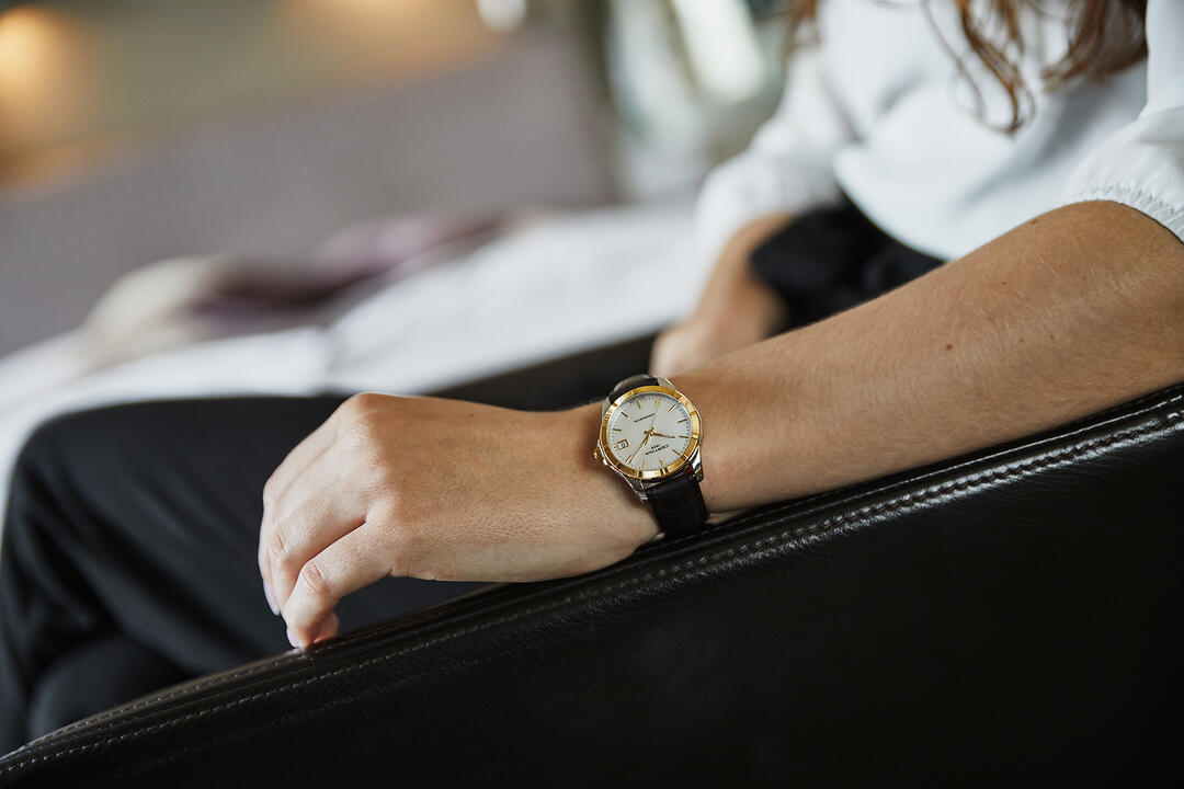 Стильный аксессуар для делового образа оснащён фигурным безелемБезельВнешний ободок, закрепляющий стекло. В спортивных часах так называется поворотное кольцо с делениями на циферблате, выполняет роль таймера – замеряет отрезки времени на шкале. Неподвижный безель – элемент декора. Однонаправленно вращающийся безель на дайверских часах позволяет фиксировать моменты погружения и выныривания на поверхность., выполненным из 18-ти каратного жёлтого золота18-каратное золотоОбозначение по каратной системе пробирования, оно показывает, сколько драгоценного металла содержится в изделии. 18 карат - в составе 75% чистого золота, соответствует 750 пробе.