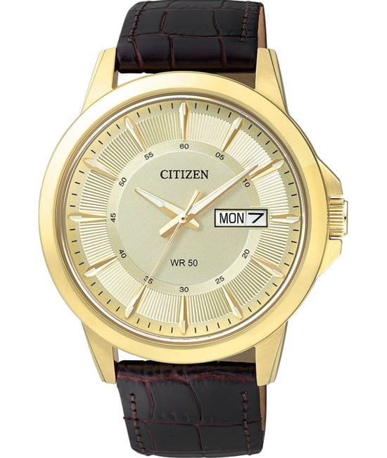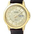 Наручные мужские часы с кварцевым механизмом, оснащенным индикаторами даты и дня недели. Стальной корпус круглой формы и кожаный ремешок, с PVD-покрытием цвета золота.