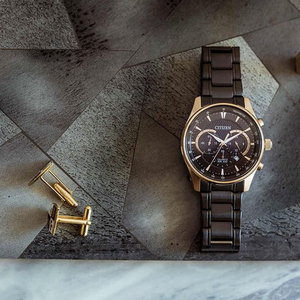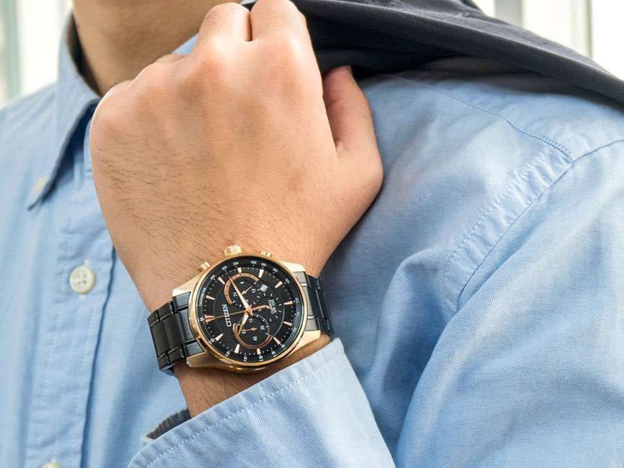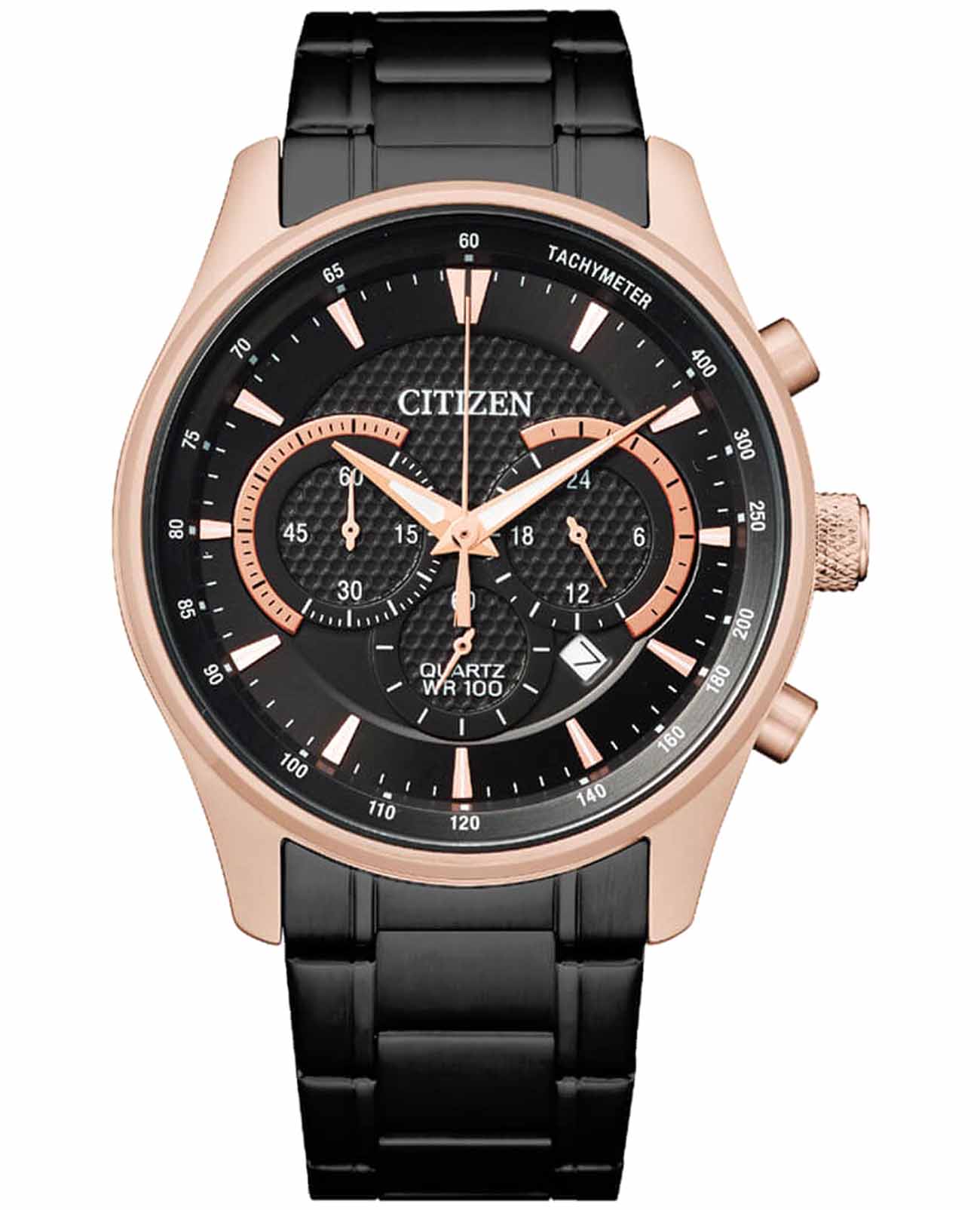 Citizen Chronograph AN8196-55E часы-хронографХронографФункция позволяет измерять отрезки времени с особой точностью: часы, минуты, секунды. Верным признаком хронографа является наличие на циферблате 3 дополнительных окошек-счётчиков. с секундомеромСекундомерСекундоме́р — прибор, способный измерять интервалы времени с точностью до долей секунды. и тахиметромТахиметрРазмеченная шкала, располагается на ободке или безеле часов. Тахиметр позволяет рассчитать скорость на определённом участке пути, расстояние измеряется в километрах или милях.. Корпус из нержавеющей стали с IP-покрытиемIP-покрытиеМетод ионного напыления. Демонстрирует повышенную устойчивость к истиранию, окислению и химическим веществам. Под воздействием высокого давления и температуры около 1500°C молекулы металла надёжно соединяются с частицами корпуса часов. диаметром 42 мм идеально сбалансирован. Минеральное стеклоМинеральное стеклоМинеральное стекло представляет собой искусственно выращенный минерал кварца. Такое стекло отличается особой устойчивостью к повреждениям и царапинам. Уступает по некоторым качествам сапфировому стеклу. обеспечивает отличную защиту циферблата от царапин. Часы работают на основе кварцевого механизма. Стальной браслет на раскладной застёжкеРаскладная застёжкаТакой тип застёжки используется только на браслетах из металла. Она никогда не раскрывается полностью, происходит разделение на 2 и более частей. Раскладывающая застёжка снизит вероятность потери часов к минимуму. идеально дополняют дизайн часов, обеспечивая комфортное ношение. Стрелки и метки на циферблате имеют люминесцентное покрытиеЛюминесцентное покрытиеПозволяет считывать показания времени в темноте. Производители наносят на стрелки, часовые индексы, безель или поверхность циферблата светонакопительный состав, дающий холодное свечение. позволяющее легко определять время даже в темноте. Циферблат украшен сотовым декоративным узором. Клиновидные стрелки в стиле Dauphine. Окошко даты находится между часовыми отметками 4 и 5. 12-ти и 24-х часовой формат времени отображается на отдельном циферблате. Часы обладают впечатляющей водонепроницаемостью до 100WR, что делает их идеальными для повседневной носки.