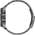 Citizen AT8286-65E — современные японские часы с кварцевым хронографомХронографФункция позволяет измерять отрезки времени с особой точностью: часы, минуты, секунды. Верным признаком хронографа является наличие на циферблате 3 дополнительных окошек-счётчиков. и секундомеромСекундомерСекундоме́р — прибор, способный измерять интервалы времени с точностью до долей секунды., выполненные в элегантном корпусе из титана с черным DLC-покрытиемDLC-покрытиеDiamond like carbon - одно из лучших видов покрытия, представляющее собой углерод с алмазными свойствами. На поверхность материала наносятся распавшиеся молекулы углерода, превращающиеся в плёнку из алмазоподобных связей, которая перенимает твёрдость алмаза. диаметром 42 мм и толщиной 11 мм. Модель оснащена инновационной технологией Eco-Drive, которая позволяет заряжать часы от солнечного света и обеспечивает запас хода до 180 дней, а при активации функции энергосбережения — до 10 месяцев без дополнительной подзарядки. Часы поддерживают автоматическую настройку времени по радиосигналу в Германии, Японии, США и Китае, а также позволяют отображать мировое времяМировое время Полезное часовое усложнение, отображающее время в основных городах и известных областях по всему миру, оно связано с часовыми поясами, удобно для путешественников и бизнесменов. для 26 городов и легко переключаться между летним и стандартным временем. Функционал включает индикацию даты и дня недели, а стрелки и часовые метки с люминесцентным покрытиемЛюминесцентное покрытиеПозволяет считывать показания времени в темноте. Производители наносят на стрелки, часовые индексы, безель или поверхность циферблата светонакопительный состав, дающий холодное свечение. обеспечивают отличную видимость в темноте. Прочное сапфировое стеклоСапфировое стеклоПрочный и надёжный материал из кристалла сапфира синтетического происхождения, характеризующийся особой твёрдостью и устойчивостью к царапинам и повреждениям. с антибликовым покрытиемАнтибликовое покрытиеСлой оксида металла в 0,13-0,3 микрон, благодаря которому стекло часов не бликует и не отражает свет. Антибликовое покрытие уменьшает отражение света в 10 раз, обеспечивая отличную читаемость показателей циферблата. устойчиво к появлению царапин и защищает лаконичный циферблат с индексами в виде штрихов. Титановый браслет с черным DLC-покрытиемDLC-покрытиеDiamond like carbon - одно из лучших видов покрытия, представляющее собой углерод с алмазными свойствами. На поверхность материала наносятся распавшиеся молекулы углерода, превращающиеся в плёнку из алмазоподобных связей, которая перенимает твёрдость алмаза. и с раскладной застёжкойРаскладная застёжкаТакой тип застёжки используется только на браслетах из металла. Она никогда не раскрывается полностью, происходит разделение на 2 и более частей. Раскладывающая застёжка снизит вероятность потери часов к минимуму. гармонично дополняет корпус, подчеркивая премиальный стиль модели. Водозащита уровня WR 100 позволяет использовать часы в повседневной жизни, в том числе во время плавания без погружения.