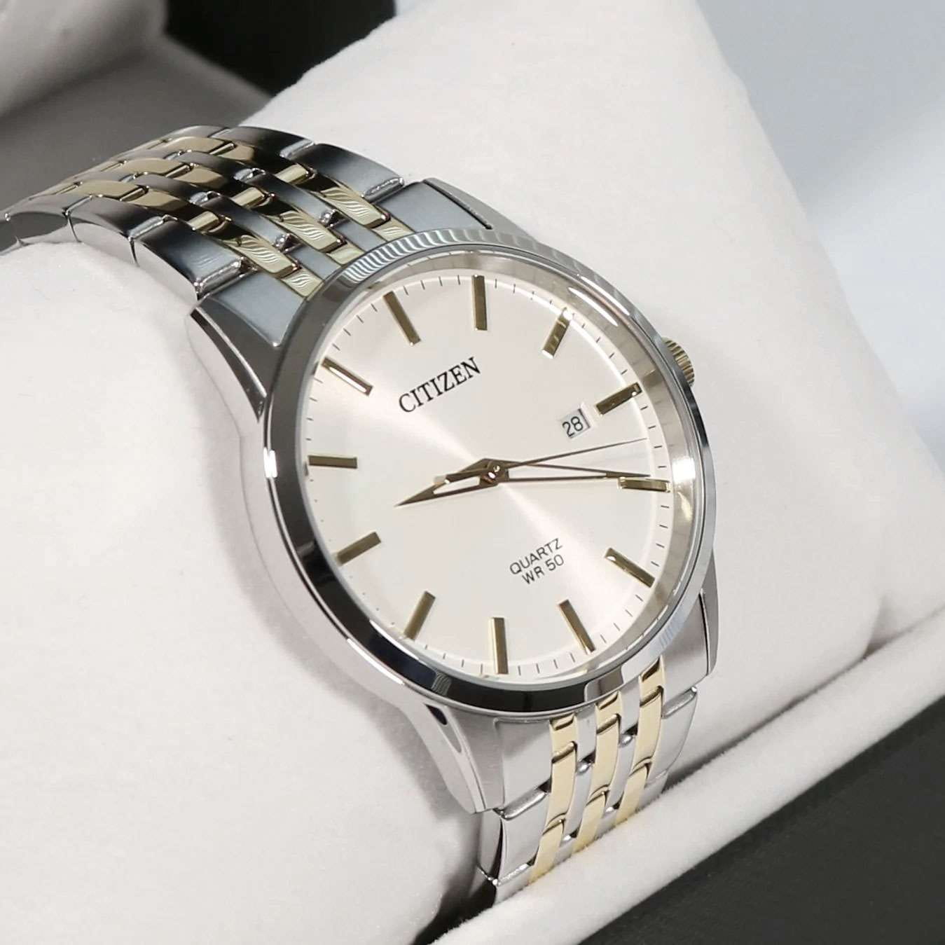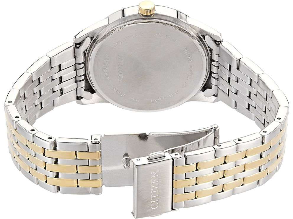 Часы Citizen BI5006-81P сочетают в себе японское качество, современный дизайн и надежность кварцевого механизма Citizen G111. Круглый корпус диаметром 39 мм выполнен из прочной нержавеющей стали, что обеспечивает долговечность и стильный внешний вид. Белый циферблат украшен метками в виде штрихов, а также дополнен окошком календаря с отображением даты и дня недели в позиции «3 часа». Стрелки с люминесцентным покрытиемЛюминесцентное покрытиеПозволяет считывать показания времени в темноте. Производители наносят на стрелки, часовые индексы, безель или поверхность циферблата светонакопительный состав, дающий холодное свечение., что обеспечивает отличную видимость в темноте. Минеральное стеклоМинеральное стеклоМинеральное стекло представляет собой искусственно выращенный минерал кварца. Такое стекло отличается особой устойчивостью к повреждениям и царапинам. Уступает по некоторым качествам сапфировому стеклу. защищает циферблат от царапин и повреждений. Рифленая заводная головка подчеркивает элегантность и практичность модели. Стальной браслет с частичным золотистым IP-покрытиемIP-покрытиеМетод ионного напыления. Демонстрирует повышенную устойчивость к истиранию, окислению и химическим веществам. Под воздействием высокого давления и температуры около 1500°C молекулы металла надёжно соединяются с частицами корпуса часов. оснащен надежной раскладной застёжкойРаскладная застёжкаТакой тип застёжки используется только на браслетах из металла. Она никогда не раскрывается полностью, происходит разделение на 2 и более частей. Раскладывающая застёжка снизит вероятность потери часов к минимуму., что обеспечивает комфортное ношение и подходит для любого случая. Водозащита до 50 метров позволяет не бояться случайных брызг и дождя.