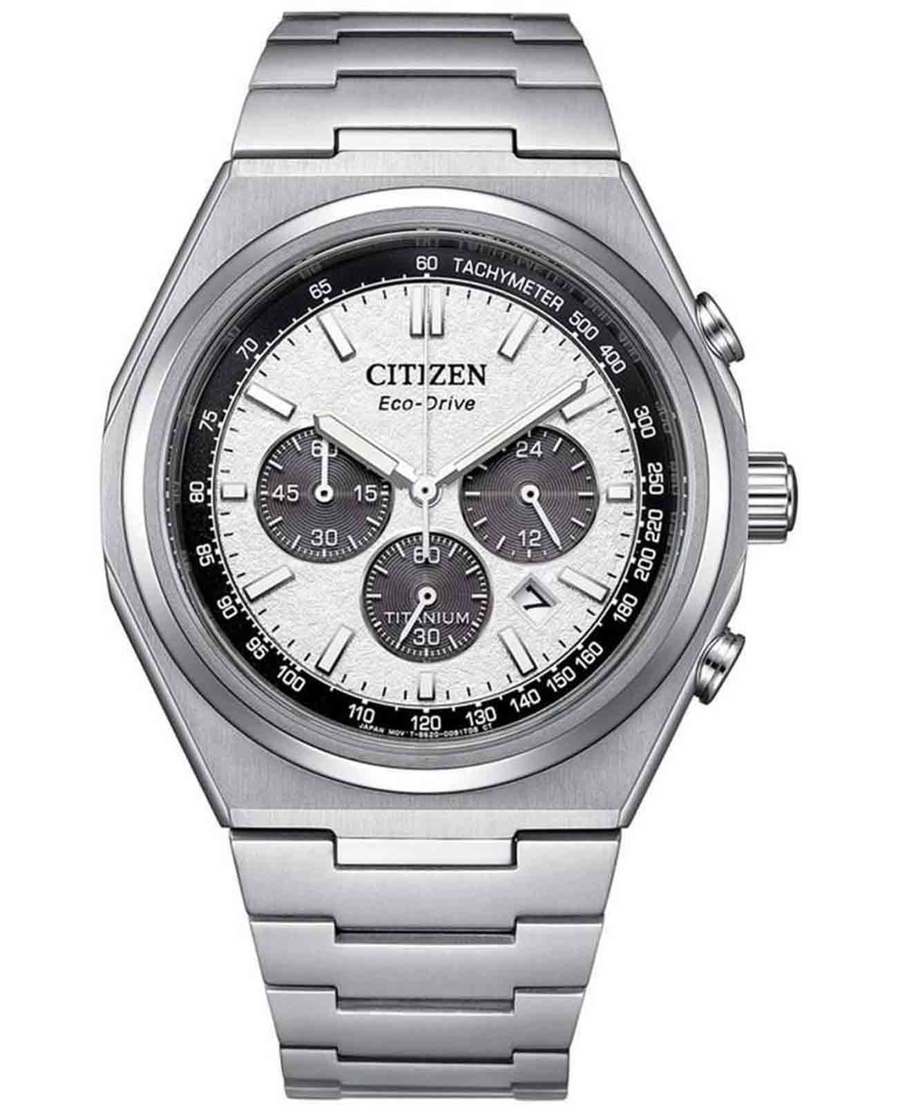 Citizen CA4610-85A — это стильные мужские кварцевые часы с функцией хронографаХронографФункция позволяет измерять отрезки времени с особой точностью: часы, минуты, секунды. Верным признаком хронографа является наличие на циферблате 3 дополнительных окошек-счётчиков., сочетающие передовые технологии и современный дизайн. Корпус и браслет выполнены из сверхлегкого и прочного титана, что обеспечивает комфортное ношение и высокую износостойкость. Серебристый круглый циферблат защищён устойчивым к царапинам сапфировым стекломСапфировое стеклоПрочный и надёжный материал из кристалла сапфира синтетического происхождения, характеризующийся особой твёрдостью и устойчивостью к царапинам и повреждениям.. Часы работают на инновационной системе Eco-Drive, питание которой осуществляется от солнечной энергии, что позволяет отказаться от замены батарейки, а запас хода достигает 9 месяцев. Стрелки с люминесцентным покрытиемЛюминесцентное покрытиеПозволяет считывать показания времени в темноте. Производители наносят на стрелки, часовые индексы, безель или поверхность циферблата светонакопительный состав, дающий холодное свечение. обеспечивают отличную читаемость времени даже в темное время суток. Для удобства предусмотрены функция предотвращения перезарядки и индикация уровня заряда EOLEOLПредставляет собой систему, уведомляющую владельца часов о необходимости замены элемента питания. За 2 недели до полного разряда батарейки секундная стрелка перестаёт ходить чётко и начинает перепрыгивать на 3-4 деления.. Надёжный японский механизм Citizen B620 обеспечивает точный ход, а центральные часовая и минутная стрелки, вынесенная на отдельный малый циферблат секундная стрелка и апертура даты между 4 и 5 часами делают использование максимально удобным. Модель поддерживает 12- и 24-часовой формат времени, а также оснащена секундомером для точного измерения промежутков. Диаметр корпуса составляет 42,5 мм, толщина — 11,6 мм, вес — около 101 грамма. Водозащита уровня WR 100 позволяет не снимать часы во время плавания без глубокого погружения. Раскладная застёжкаРаскладная застёжкаТакой тип застёжки используется только на браслетах из металла. Она никогда не раскрывается полностью, происходит разделение на 2 и более частей. Раскладывающая застёжка снизит вероятность потери часов к минимуму. на браслете обеспечивает надежную фиксацию на запястье. Модель оснащена хронографомХронографФункция позволяет измерять отрезки времени с особой точностью: часы, минуты, секунды. Верным признаком хронографа является наличие на циферблате 3 дополнительных окошек-счётчиков. с секундомеромСекундомерСекундоме́р — прибор, способный измерять интервалы времени с точностью до долей секунды. и тахиметромТахиметрРазмеченная шкала, располагается на ободке или безеле часов. Тахиметр позволяет рассчитать скорость на определённом участке пути, расстояние измеряется в километрах или милях..