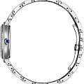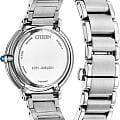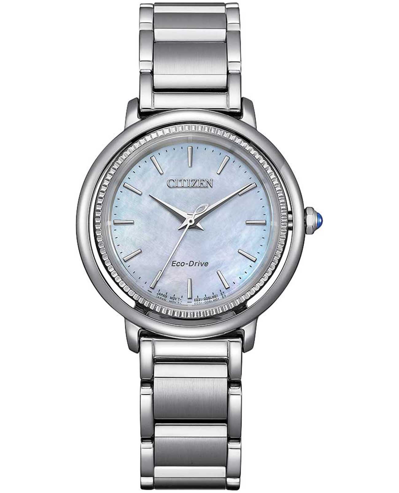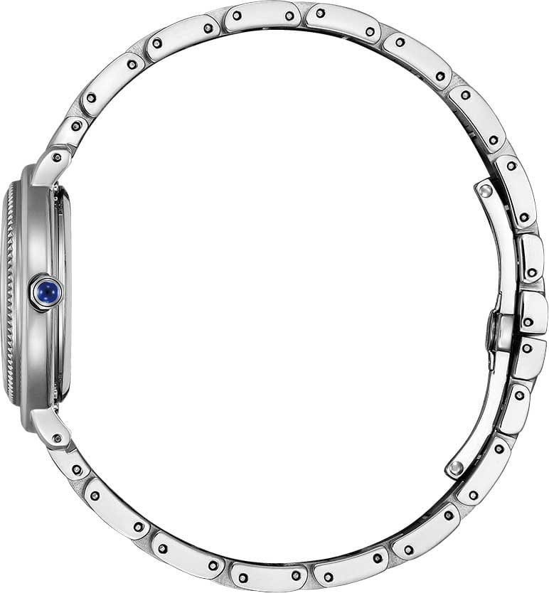 Элегантные часы Citizen EM1100-84D произведены в Японии и оснащены современным кварцевым механизмом Citizen E031 с инновационной системой Eco-Drive, которая использует энергию солнечного света и не требует замены батарейки, обеспечивая до 180 дней работы в автономном режиме. Корпус и браслет выполнены из высококачественной нержавеющей стали, что гарантирует долговечность и износостойкость. Перламутровый голубой циферблат с изящными штриховыми метками защищён выпуклым сапфировым стекломСапфировое стеклоПрочный и надёжный материал из кристалла сапфира синтетического происхождения, характеризующийся особой твёрдостью и устойчивостью к царапинам и повреждениям., устойчивым к царапинам. БезельБезельВнешний ободок, закрепляющий стекло. В спортивных часах так называется поворотное кольцо с делениями на циферблате, выполняет роль таймера – замеряет отрезки времени на шкале. Неподвижный безель – элемент декора. Однонаправленно вращающийся безель на дайверских часах позволяет фиксировать моменты погружения и выныривания на поверхность. часов декорирован алмазной гранью, а заводная головка украшена камнем в форме кабошона, что придаёт модели особый шарм. Задняя крышка закреплена на четырёх винтах, что повышает надёжность конструкции. Часы имеют водозащиту до 50 метров, а также функцию индикации заряда и предотвращения перезарядки. Размер корпуса составляет 31,2 мм в диаметре и 8 мм в толщину, вес — 71 грамм. Застежка «бабочка»Застёжка "бабочка"Такой вид застёжки дополняется предохранителями, помогающими избежать случайного раскрытия браслета. Обладают изящным исполнением. у браслета обеспечивает комфортное и надёжное ношение. Эта модель идеально подчеркнёт изысканный стиль и индивидуальность своей обладательницы.