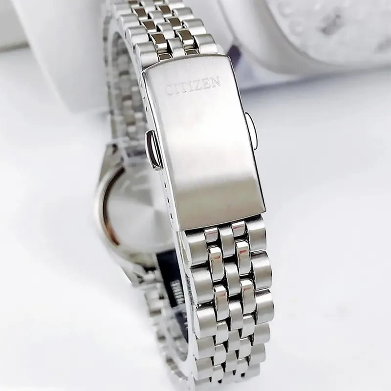 Часы Citizen EU6060-55D представляют собой элегантную модель, выполненную в Японии, сочетающую в себе современные технологии и утончённый дизайн. Корпус и браслет изготовлены из прочной нержавеющей стали, что обеспечивает долговечность и привлекательный внешний вид. Диаметр корпуса составляет 26 мм, что делает часы изящными и аккуратными на запястье. Особое внимание привлекает безельБезельВнешний ободок, закрепляющий стекло. В спортивных часах так называется поворотное кольцо с делениями на циферблате, выполняет роль таймера – замеряет отрезки времени на шкале. Неподвижный безель – элемент декора. Однонаправленно вращающийся безель на дайверских часах позволяет фиксировать моменты погружения и выныривания на поверхность., украшенный мерцающими кристаллами, которые придают часам особый шарм и изысканность. Стрелки с люминесцентным покрытиемЛюминесцентное покрытиеПозволяет считывать показания времени в темноте. Производители наносят на стрелки, часовые индексы, безель или поверхность циферблата светонакопительный состав, дающий холодное свечение.. Надёжный кварцевый механизм гарантирует точность хода, а водозащита уровня WR 50 позволяет не снимать часы при мытье рук или во время дождя. Циферблат украшен часовыми индексами в виде штрихов, а также оснащён окошком даты в позиции 3 часа, центральными стрелками часов, минут и секунд для удобного считывания времени и кристаллами. Минеральное стеклоМинеральное стеклоМинеральное стекло представляет собой искусственно выращенный минерал кварца. Такое стекло отличается особой устойчивостью к повреждениям и царапинам. Уступает по некоторым качествам сапфировому стеклу. устойчиво к появлению мелких царапин, сохраняя прозрачность и презентабельный вид. Стальной браслет с раскладной застёжкойРаскладная застёжкаТакой тип застёжки используется только на браслетах из металла. Она никогда не раскрывается полностью, происходит разделение на 2 и более частей. Раскладывающая застёжка снизит вероятность потери часов к минимуму. надежно фиксирует часы на запястье, обеспечивая комфорт при ежедневном ношении.