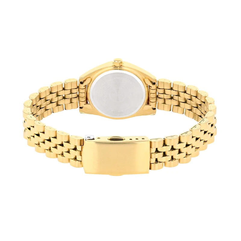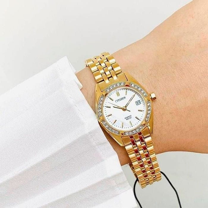 Элегантные часы Citizen EU6062-50D сочетают в себе изысканный дизайн и надежность японского качества. Круглый корпус диаметром 26 мм изготовлен из нержавеющей стали с PVD-покрытиемPVDУльтратонкое покрытие наносится в технике вакуумного напыления, сочетает в себе нитрид титана особой прочности со слоем золота или оксида хрома. Несёт в себе декоративную или защитную функцию. цвета желтого золота и украшен сверкающими кристаллами по безелюБезельВнешний ободок, закрепляющий стекло. В спортивных часах так называется поворотное кольцо с делениями на циферблате, выполняет роль таймера – замеряет отрезки времени на шкале. Неподвижный безель – элемент декора. Однонаправленно вращающийся безель на дайверских часах позволяет фиксировать моменты погружения и выныривания на поверхность., что придает модели утонченный вид. Перламутровый циферблат дополнен центральными стрелками и апертурой даты на позиции 3 часов. Минеральное стеклоМинеральное стеклоМинеральное стекло представляет собой искусственно выращенный минерал кварца. Такое стекло отличается особой устойчивостью к повреждениям и царапинам. Уступает по некоторым качествам сапфировому стеклу. защищает от мелких повреждений, а стальной браслет с раскладной застёжкойРаскладная застёжкаТакой тип застёжки используется только на браслетах из металла. Она никогда не раскрывается полностью, происходит разделение на 2 и более частей. Раскладывающая застёжка снизит вероятность потери часов к минимуму. обеспечивает комфортную посадку. Стрелки с люминесцентным покрытиемЛюминесцентное покрытиеПозволяет считывать показания времени в темноте. Производители наносят на стрелки, часовые индексы, безель или поверхность циферблата светонакопительный состав, дающий холодное свечение. для отличной читаемости в любое время суток. Благодаря водостойкости WR 50 часы подходят для повседневного ношения, включая мытье рук и дождь.
