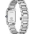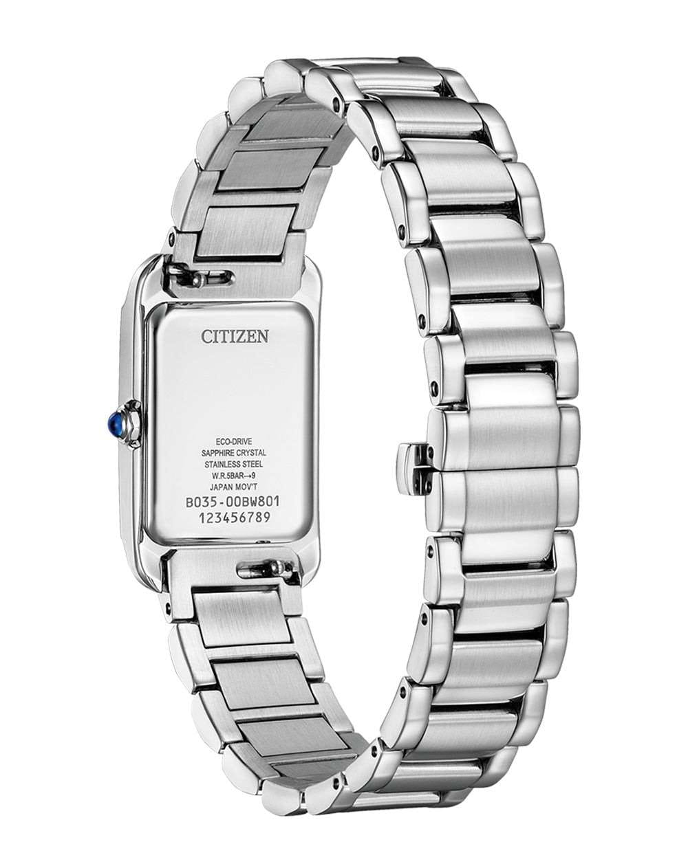 Изящные женские часы Citizen EW5620-55A сочетают в себе японское качество и современный дизайн. Корпус прямоугольной формы выполнен из прочной нержавеющей стали, а элегантный браслет оснащён удобной застежкой «бабочка»Застёжка "бабочка"Такой вид застёжки дополняется предохранителями, помогающими избежать случайного раскрытия браслета. Обладают изящным исполнением. . Серебристый перламутровый циферблат украшен римскими цифрами и изысканными синими стрелками. Модель оснащена надёжным кварцевым механизмом японского производства, защищена сапфировым стекломСапфировое стеклоПрочный и надёжный материал из кристалла сапфира синтетического происхождения, характеризующийся особой твёрдостью и устойчивостью к царапинам и повреждениям. и обладает водозащитой WR 50, что позволяет использовать часы во время плавания. Размеры корпуса — 19 мм в ширину, 32,5 мм в высоту и 7 мм в толщину.