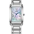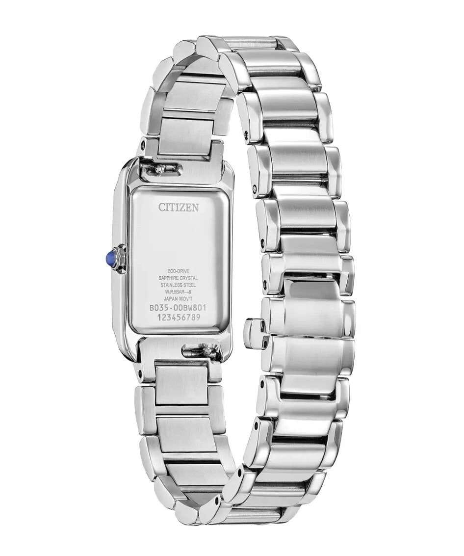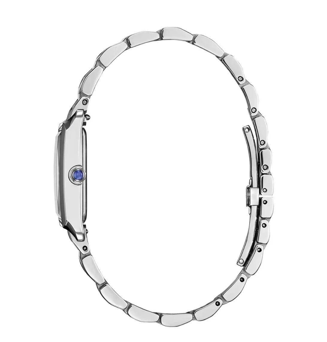 Изящные женские часы Citizen EW5620-55N сочетают в себе японское качество и современный дизайн. Корпус прямоугольной формы выполнен из прочной нержавеющей стали, а элегантный браслет оснащён удобной застежкой «бабочка»Застёжка "бабочка"Такой вид застёжки дополняется предохранителями, помогающими избежать случайного раскрытия браслета. Обладают изящным исполнением. . Перламутровый циферблат украшен римскими цифрами и изысканными синими стрелками. Модель оснащена надёжным кварцевым механизмом японского производства, защищена сапфировым стекломСапфировое стеклоПрочный и надёжный материал из кристалла сапфира синтетического происхождения, характеризующийся особой твёрдостью и устойчивостью к царапинам и повреждениям. и обладает водозащитой WR 50, что позволяет использовать часы во время плавания. Размеры корпуса — 19 мм в ширину, 32,5 мм в высоту и 7 мм в толщину. На изделие предоставляется гарантия сроком 1 год.