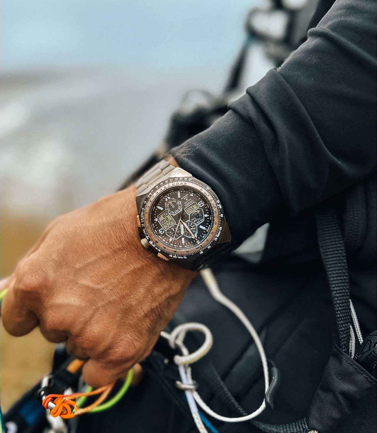 Citizen Promaster JY8146-54E часы-хронографХронографФункция позволяет измерять отрезки времени с особой точностью: часы, минуты, секунды. Верным признаком хронографа является наличие на циферблате 3 дополнительных окошек-счётчиков. с секундомеромСекундомерСекундоме́р — прибор, способный измерять интервалы времени с точностью до долей секунды. спортивного дизайна с высоким уровнем водозащиты. Лимитированная серия - 5600 экземпляров. Модель посвящена 35-летию коллекции Promaster. Корпус из нержавеющей стали с IP-покрытиемIP-покрытиеМетод ионного напыления. Демонстрирует повышенную устойчивость к истиранию, окислению и химическим веществам. Под воздействием высокого давления и температуры около 1500°C молекулы металла надёжно соединяются с частицами корпуса часов. диаметром 45,7 мм идеально сбалансирован. Сапфировое стеклоСапфировое стеклоПрочный и надёжный материал из кристалла сапфира синтетического происхождения, характеризующийся особой твёрдостью и устойчивостью к царапинам и повреждениям. с антибликовым покрытием обеспечивает отличную защиту циферблата от царапин. Часы работают на основе кварцевого механизма, питание от солнечной энергии. Стальной браслет на раскладной застёжкеРаскладная застёжкаТакой тип застёжки используется только на браслетах из металла. Она никогда не раскрывается полностью, происходит разделение на 2 и более частей. Раскладывающая застёжка снизит вероятность потери часов к минимуму. идеально дополняют дизайн часов, обеспечивая комфортное ношение. Стрелки и метки на циферблате имеют люминесцентное покрытиеЛюминесцентное покрытиеПозволяет считывать показания времени в темноте. Производители наносят на стрелки, часовые индексы, безель или поверхность циферблата светонакопительный состав, дающий холодное свечение. позволяющее легко определять время даже в темноте. Поворотный безельБезельВнешний ободок, закрепляющий стекло. В спортивных часах так называется поворотное кольцо с делениями на циферблате, выполняет роль таймера – замеряет отрезки времени на шкале. Неподвижный безель – элемент декора. Однонаправленно вращающийся безель на дайверских часах позволяет фиксировать моменты погружения и выныривания на поверхность. с IP-покрытиемIP-покрытиеМетод ионного напыления. Демонстрирует повышенную устойчивость к истиранию, окислению и химическим веществам. Под воздействием высокого давления и температуры около 1500°C молекулы металла надёжно соединяются с частицами корпуса часов.. Автоматический прием сигналов от радиовышек, расположенных в различных точках земного шара, которые передают временные сигналы от определенных атомных часов. Коррекция текущего времени радиосигналом на территории почти всей Европы, США, Японии и Китая. Функция индикации заряда (EOL) и предотвращения перезарядки. Мировое времяМировое время Полезное часовое усложнение, отображающее время в основных городах и известных областях по всему миру, оно связано с часовыми поясами, удобно для путешественников и бизнесменов. - 43 города, переход на зимнее и летнее время. Всемирное координированное время UTCUTCВсемирное кординационное время, не имеющее привязки к географическому положению Гринвича, основывается на атомном отсчёте времени. Регулировка времени осуществляется более точно, чем устаревшее GMT.