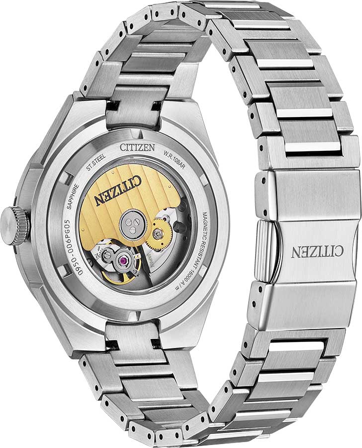 Citizen SERIES 8 NA1036-56E мужские часы спортивного дизайна с высоким уровнем водозащиты. Корпус из нержавеющей стали диаметром 40,8 мм идеально сбалансирован. Сапфировое стеклоСапфировое стеклоПрочный и надёжный материал из кристалла сапфира синтетического происхождения, характеризующийся особой твёрдостью и устойчивостью к царапинам и повреждениям. с антибликовым покрытием обеспечивает отличную защиту циферблата от царапин. Механические часы с автоподзаводом. Стальной браслет на раскладной застёжкеРаскладная застёжкаТакой тип застёжки используется только на браслетах из металла. Она никогда не раскрывается полностью, происходит разделение на 2 и более частей. Раскладывающая застёжка снизит вероятность потери часов к минимуму. идеально дополняют дизайн часов, обеспечивая комфортное ношение. Стрелки и метки на циферблате имеют люминесцентное покрытиеЛюминесцентное покрытиеПозволяет считывать показания времени в темноте. Производители наносят на стрелки, часовые индексы, безель или поверхность циферблата светонакопительный состав, дающий холодное свечение. позволяющее легко определять время даже в темноте. БезельБезельВнешний ободок, закрепляющий стекло. В спортивных часах так называется поворотное кольцо с делениями на циферблате, выполняет роль таймера – замеряет отрезки времени на шкале. Неподвижный безель – элемент декора. Однонаправленно вращающийся безель на дайверских часах позволяет фиксировать моменты погружения и выныривания на поверхность. с частичным IP-покрытиемIP-покрытиеМетод ионного напыления. Демонстрирует повышенную устойчивость к истиранию, окислению и химическим веществам. Под воздействием высокого давления и температуры около 1500°C молекулы металла надёжно соединяются с частицами корпуса часов.. Окошко даты находится в положении 3 часа. Магнитоустойчивость 16000 а/м. Запас хода около 50 часов. Часы обладают впечатляющей водонепроницаемостью до 100WR, что делает их идеальными для повседневной носки. Прозрачная задняя крышка.
