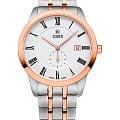Мужские наручные часы Cover CO194.08 из коллекции Nobila Gent сочетают в себе классический дизайн и надежность современных технологий. Модель обладает круглым корпусом диаметром 40 мм, изготовленным из нержавеющей стали. Браслет с частичным PVD-покрытиемPVDУльтратонкое покрытие наносится в технике вакуумного напыления, сочетает в себе нитрид титана особой прочности со слоем золота или оксида хрома. Несёт в себе декоративную или защитную функцию., что обеспечивает высокую устойчивость к внешним воздействиям. БезельБезельВнешний ободок, закрепляющий стекло. В спортивных часах так называется поворотное кольцо с делениями на циферблате, выполняет роль таймера – замеряет отрезки времени на шкале. Неподвижный безель – элемент декора. Однонаправленно вращающийся безель на дайверских часах позволяет фиксировать моменты погружения и выныривания на поверхность. с PVD-покрытиемPVDУльтратонкое покрытие наносится в технике вакуумного напыления, сочетает в себе нитрид титана особой прочности со слоем золота или оксида хрома. Несёт в себе декоративную или защитную функцию.. Белый циферблат оснащен окном даты на «6 часах» и вынесенной секундной стрелкой на отдельном циферблате, делая модель практичной для повседневного использования. Для защиты используется сапфировое стеклоСапфировое стеклоПрочный и надёжный материал из кристалла сапфира синтетического происхождения, характеризующийся особой твёрдостью и устойчивостью к царапинам и повреждениям. с антибликовым покрытиемАнтибликовое покрытиеСлой оксида металла в 0,13-0,3 микрон, благодаря которому стекло часов не бликует и не отражает свет. Антибликовое покрытие уменьшает отражение света в 10 раз, обеспечивая отличную читаемость показателей циферблата., обеспечивающее прочную защиту от царапин и оптимальную видимость в любых условиях. Часы работают на швейцарском кварцевом механизме Ronda 6004.D, что гарантирует точное время без необходимости подзаводки. Браслет выполнен из нержавеющей стали с раскладной застежкой, гарантирующей комфортное ношение и безопасность.Водонепроницаемость часов достигает 5 атмосфер (50 метров), что позволяет использовать их в условиях легкого контакта с водой, однако не рекомендуется для плавания или водных видов спорта.
