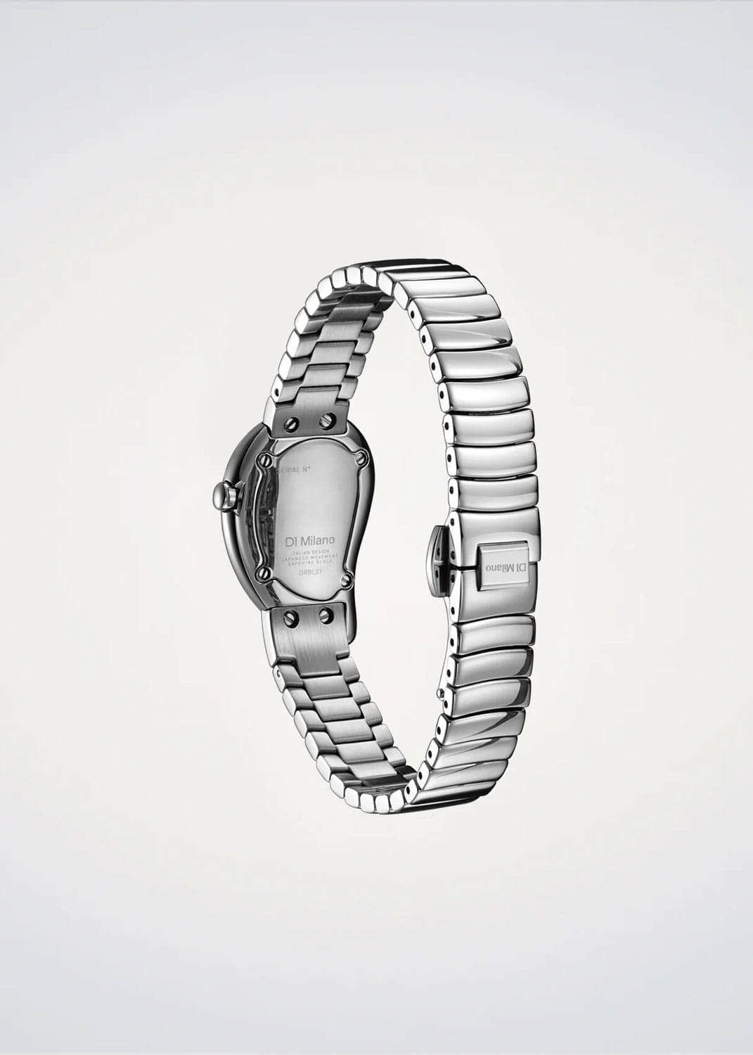 Женские кварцевые часы D1 Milano Drop DRBL01 — это стильное сочетание элегантности и современного дизайна. Стальной корпус в форме капли выполнен из нержавеющей стали серебристого цвета, диаметром 23 мм, что придаст образу элегантности и надежности. Изысканный циферблат с метками в виде штрихов придает модели особый блеск. Циферблат защищен сапфировым стекломСапфировое стеклоПрочный и надёжный материал из кристалла сапфира синтетического происхождения, характеризующийся особой твёрдостью и устойчивостью к царапинам и повреждениям. с антибликовым покрытиемАнтибликовое покрытиеСлой оксида металла в 0,13-0,3 микрон, благодаря которому стекло часов не бликует и не отражает свет. Антибликовое покрытие уменьшает отражение света в 10 раз, обеспечивая отличную читаемость показателей циферблата., обеспечивающий устойчивость к царапинам. Часы оснащены надежным кварцевым механизмом. Стальной браслет на застёжке-бабочке с кнопкамиЗастёжка "бабочка"Такой вид застёжки дополняется предохранителями, помогающими избежать случайного раскрытия браслета. Обладают изящным исполнением. , гарантирует комфортное и безопасное ношение. Класс водозащиты: 50 метров позволит защитить корпус от случайных брызг или капель дождя. Отличный выбор для тех, кто ценит утонченность и качество.