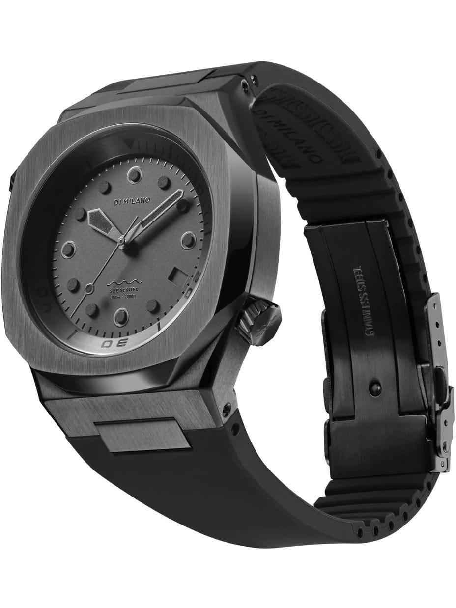 Часы D1 Milano DVRJSH — это механические мужские часы с автоподзаводом, которые поражают своим спортивным стилем и точностью исполнения. С этими удобными часами покорение морских глубин выйдет на новый уровень. Корпус с безелемБезельВнешний ободок, закрепляющий стекло. В спортивных часах так называется поворотное кольцо с делениями на циферблате, выполняет роль таймера – замеряет отрезки времени на шкале. Неподвижный безель – элемент декора. Однонаправленно вращающийся безель на дайверских часах позволяет фиксировать моменты погружения и выныривания на поверхность. из нержавеющей стали с PVDPVDУльтратонкое покрытие наносится в технике вакуумного напыления, сочетает в себе нитрид титана особой прочности со слоем золота или оксида хрома. Несёт в себе декоративную или защитную функцию. покрытием гармонично сочетается с таким же черным циферблатом. Запас хода 41 час. Циферблат защищен сапфировым стекломСапфировое стеклоПрочный и надёжный материал из кристалла сапфира синтетического происхождения, характеризующийся особой твёрдостью и устойчивостью к царапинам и повреждениям., а черный силиконовый ремешок придает ему элегантный вид. На циферблате часов есть окошко даты в положении 4 часа. Водонепроницаемость часов достигает 300 метров, что делает их подходящими для для дайвинга.