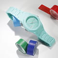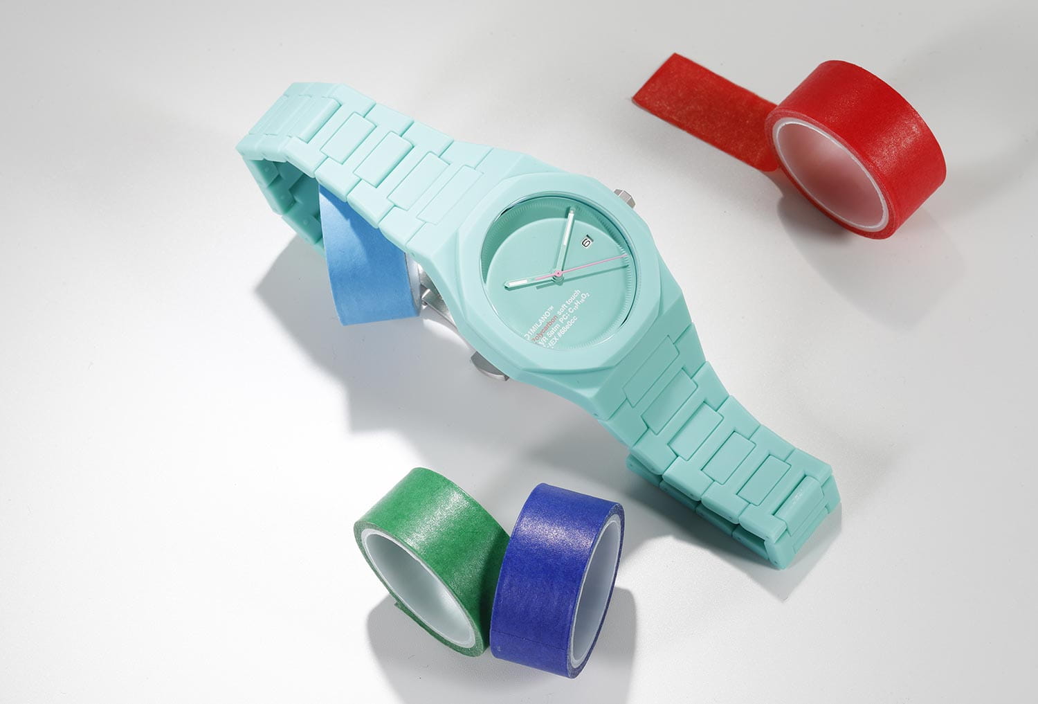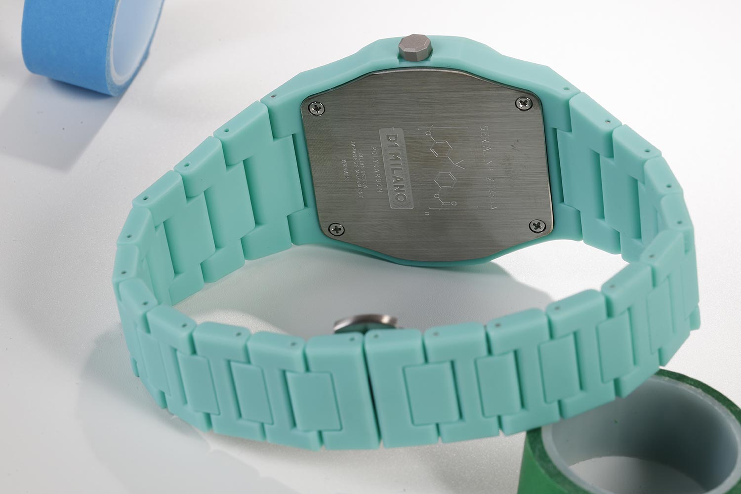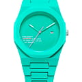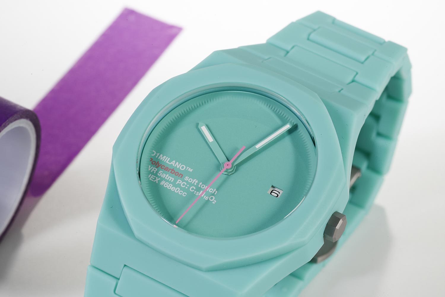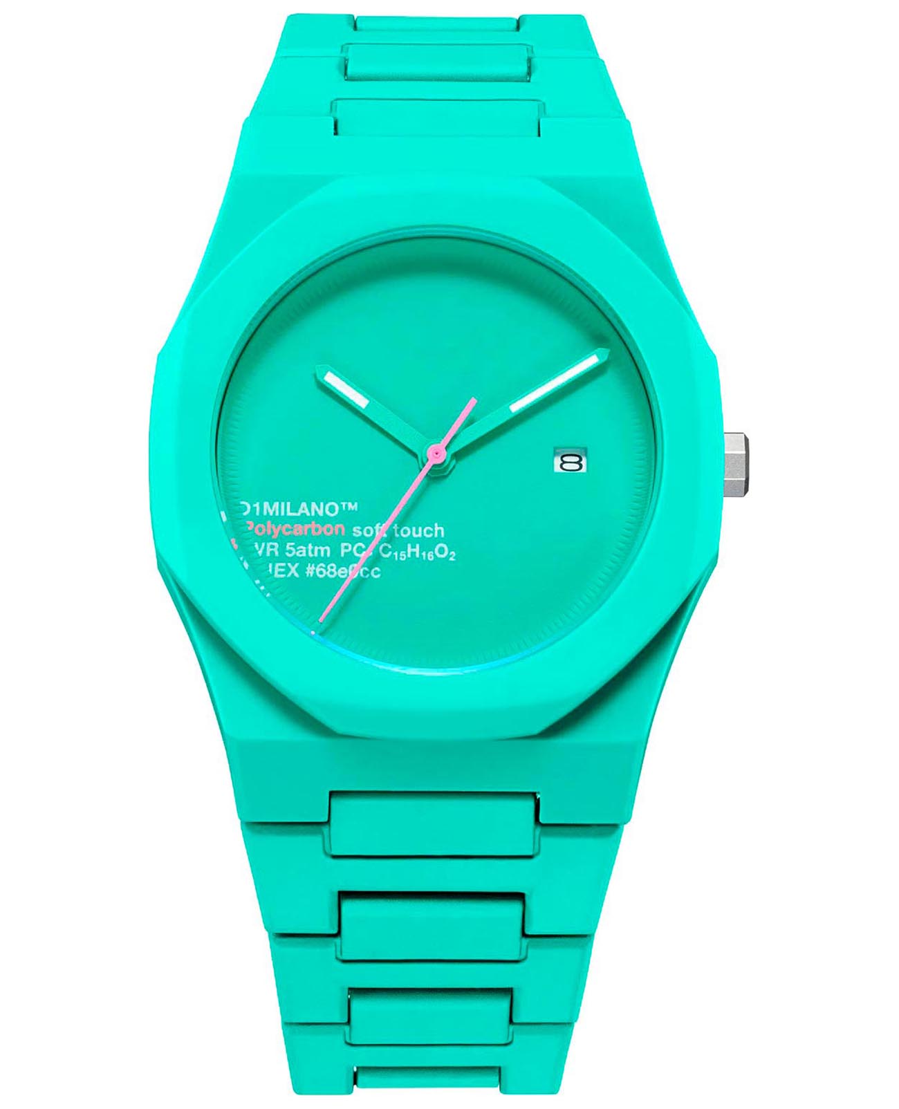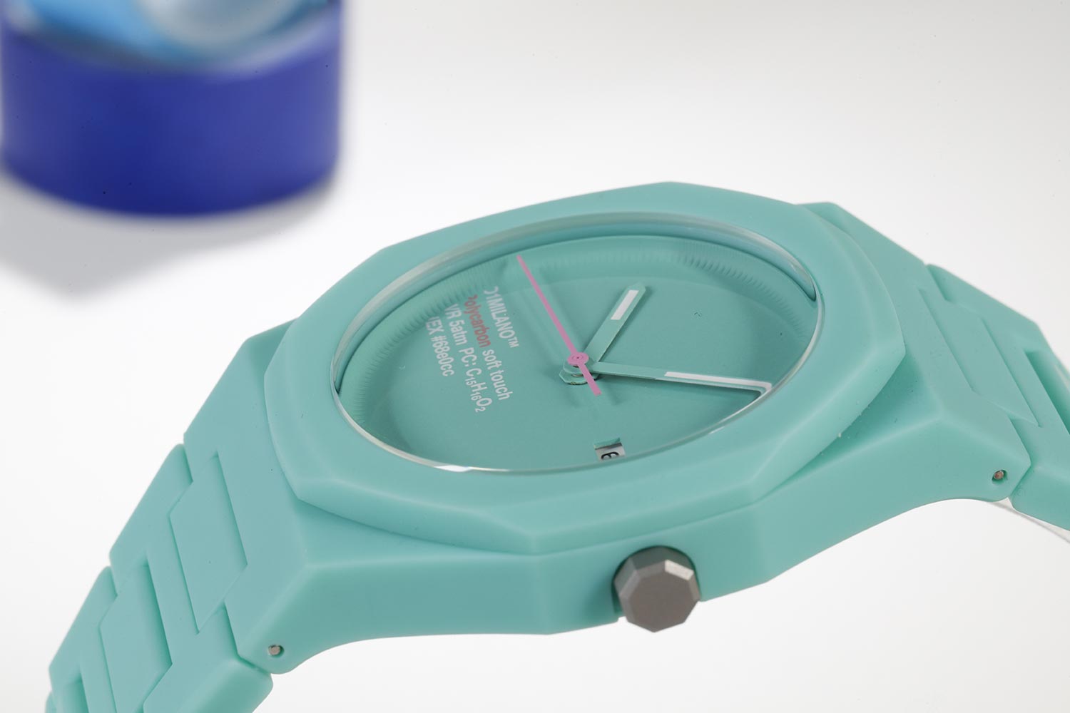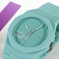 Часы D1 Milano Polycarbon HPCBJ31 – молодежные часы в стиле унисекс для повседневных образов. Кварцевые часы с калибром Seiko VJ32B. Модель HotHot Aqua Polycarbon имеет бирюзовый корпус из поликарбоната с покрытием Софт-Тач. Циферблат лаконичный без индексов, защищен минеральным стекломМинеральное стеклоМинеральное стекло представляет собой искусственно выращенный минерал кварца. Такое стекло отличается особой устойчивостью к повреждениям и царапинам. Уступает по некоторым качествам сапфировому стеклу. с антибликовым покрытием. Стрелки с люминесцентным покрытиемЛюминесцентное покрытиеПозволяет считывать показания времени в темноте. Производители наносят на стрелки, часовые индексы, безель или поверхность циферблата светонакопительный состав, дающий холодное свечение.. Окошко даты находится в положении 3 часов. Яркая секундная стрелка дополняет стильный образ. Стальная задняя крышка на 4 винтах. Пластиковый браслет на застёжке «бабочка» с кнопкамиЗастёжка "бабочка"Такой вид застёжки дополняется предохранителями, помогающими избежать случайного раскрытия браслета. Обладают изящным исполнением. .