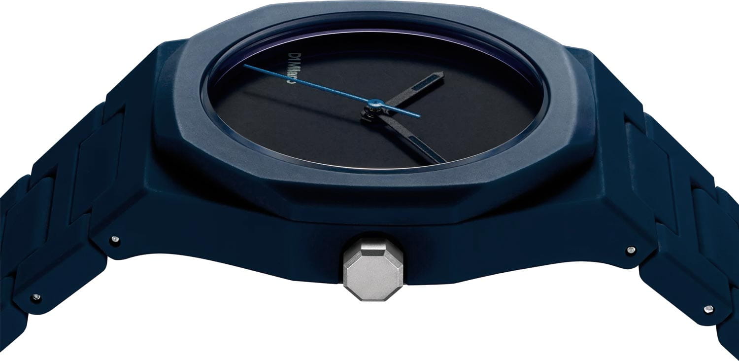 Часы D1 Milano Polycarbon PCBU09 – молодежные часы в стиле унисекс для повседневных образов, стильные и комфортные. Модель имеет темно-синий корпус и браслет из поликарбоната с покрытием Софт-Тач.. Циферблат лаконичный с индексами в виде штрихов, защищен минеральным стекломМинеральное стеклоМинеральное стекло представляет собой искусственно выращенный минерал кварца. Такое стекло отличается особой устойчивостью к повреждениям и царапинам. Уступает по некоторым качествам сапфировому стеклу. с антибликовым покрытием. Стальная задняя крышка на 4 винтах. Пластиковый браслет на застёжке-бабочке с кнопкамиЗастёжка "бабочка"Такой вид застёжки дополняется предохранителями, помогающими избежать случайного раскрытия браслета. Обладают изящным исполнением. .