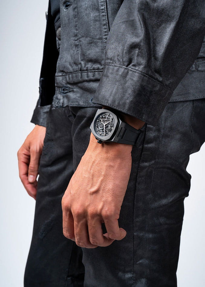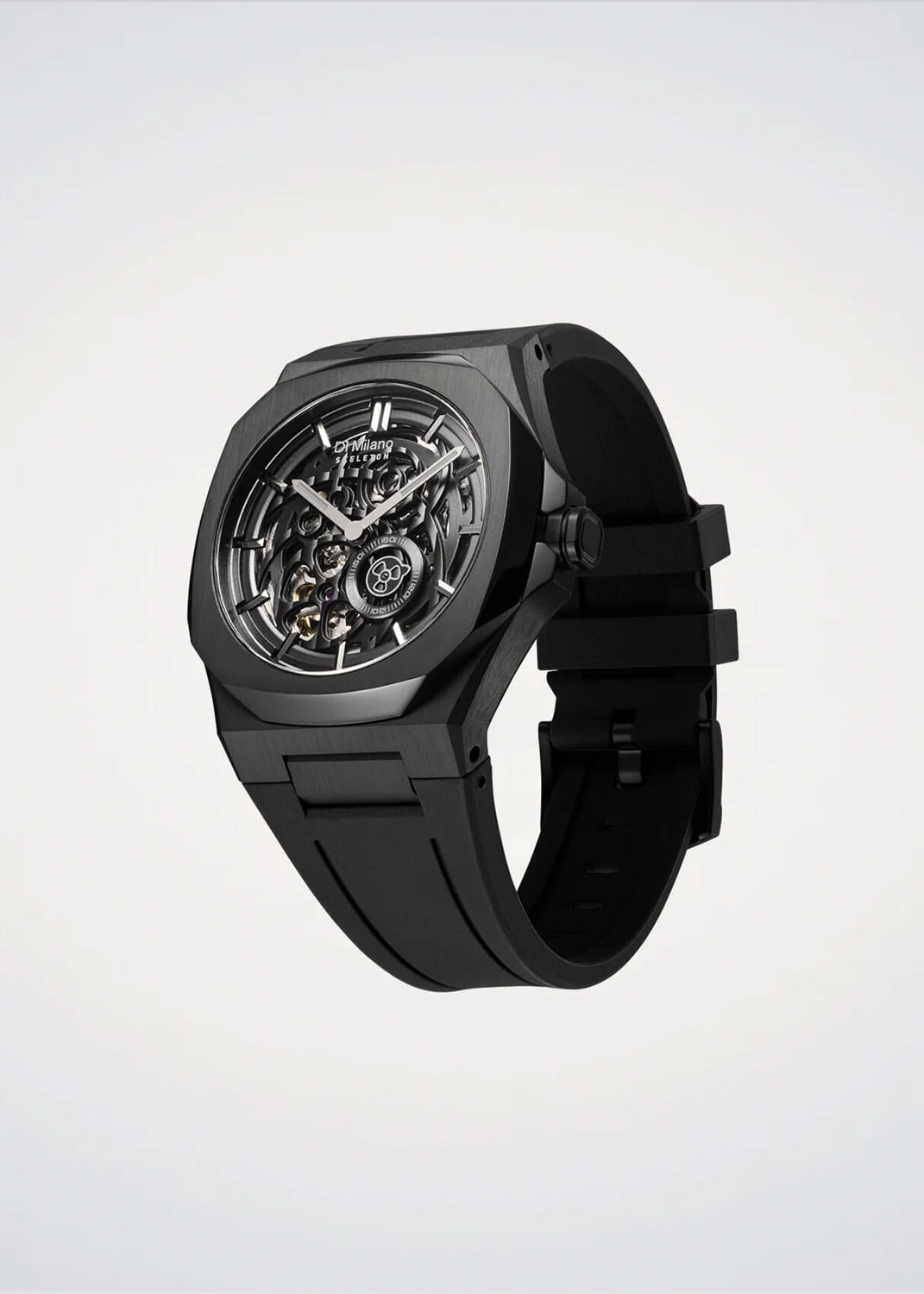 Часы D1 Milano Skeleton SKRJ17 — это эффектные механические мужские часы, разработанные для ценителей уникальных аксессуаров. Их утонченный дизайн и высокое качество исполнения делают эти часы незаменимым элементом вашего стиля. Изготовленные в Италии, они оснащены надежным механизмом Miyota 8N40 с автоподзаводом, обеспечивающими запас хода до 42 часа. Частота работы механизма составляет 21600 полуколебаний в час. Часы имеют корпус из нержавеющей стали с PVD-покрытиемPVDУльтратонкое покрытие наносится в технике вакуумного напыления, сочетает в себе нитрид титана особой прочности со слоем золота или оксида хрома. Несёт в себе декоративную или защитную функцию. черного цвета, что гарантирует долговечность и стойкость к внешним воздействиям. Скелетонизированный циферблат защищен сапфировым стекломСапфировое стеклоПрочный и надёжный материал из кристалла сапфира синтетического происхождения, характеризующийся особой твёрдостью и устойчивостью к царапинам и повреждениям. с антибликовым покрытиемАнтибликовое покрытиеСлой оксида металла в 0,13-0,3 микрон, благодаря которому стекло часов не бликует и не отражает свет. Антибликовое покрытие уменьшает отражение света в 10 раз, обеспечивая отличную читаемость показателей циферблата., подчеркивающим элегантность и изысканность модели и защищает от царапин. Стрелки с люминесцентным покрытиемЛюминесцентное покрытиеПозволяет считывать показания времени в темноте. Производители наносят на стрелки, часовые индексы, безель или поверхность циферблата светонакопительный состав, дающий холодное свечение.. Метки в виде штрихов и прозрачная задняя крышка, закрепленная на 8 винтах, придают часам особый шарм. Каучуковый ремешок с классической застежкой обеспечивает комфортное и надежное ношение. Водозащита до 50 WR делает эти часы подходящими для повседневного использования.