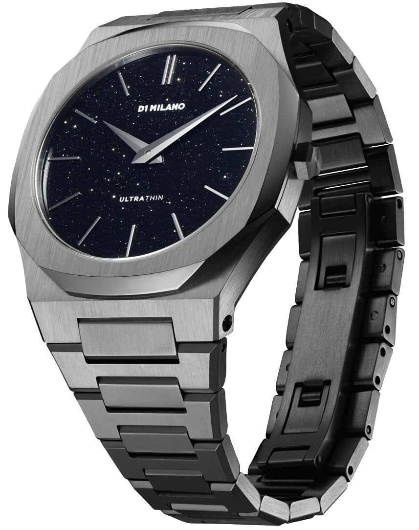 Часы D1 Milano UTBJ29 — это уникальные кварцевые часы, которые подчеркнут ваш изысканный стиль. Эти наручные часы из коллекции Ultra Thin с эффектным монохромным дизайном станут выразительным акцентом вашего образа. Корпус диаметром 40 мм из нержавеющей стали с PVDPVDУльтратонкое покрытие наносится в технике вакуумного напыления, сочетает в себе нитрид титана особой прочности со слоем золота или оксида хрома. Несёт в себе декоративную или защитную функцию. покрытием придает часам современный и утонченный вид. Черный циферблат выполнен в стилистике звездного неба, с метками в виде штрихов и такие же черные хроматические стрелки и индексы подчеркивают элегантность модели. Задняя крышка из нержавеющей стали закреплена на 8-х винтах и дополнена индивидуальным серийным номером, что подчеркивает уникальность каждого экземпляра. Стальной браслет с PVDPVDУльтратонкое покрытие наносится в технике вакуумного напыления, сочетает в себе нитрид титана особой прочности со слоем золота или оксида хрома. Несёт в себе декоративную или защитную функцию. покрытием и с раскладной застёжкойРаскладная застёжкаТакой тип застёжки используется только на браслетах из металла. Она никогда не раскрывается полностью, происходит разделение на 2 и более частей. Раскладывающая застёжка снизит вероятность потери часов к минимуму. обеспечивает надежность и комфорт в повседневном использовании. Сапфировое стеклоСапфировое стеклоПрочный и надёжный материал из кристалла сапфира синтетического происхождения, характеризующийся особой твёрдостью и устойчивостью к царапинам и повреждениям. с антибликовым покрытием защищает циферблат, а водозащита до 50WR делает эти часы практичным выбором для любых условий. Благодаря калибру Miyota GL24, они отличаются точностью и надежностью. Эти итальянские часы представляют собой идеальное сочетание традиционного мастерства и инновационного подхода, воплощая в себе новый взгляд на классическую элегантность.