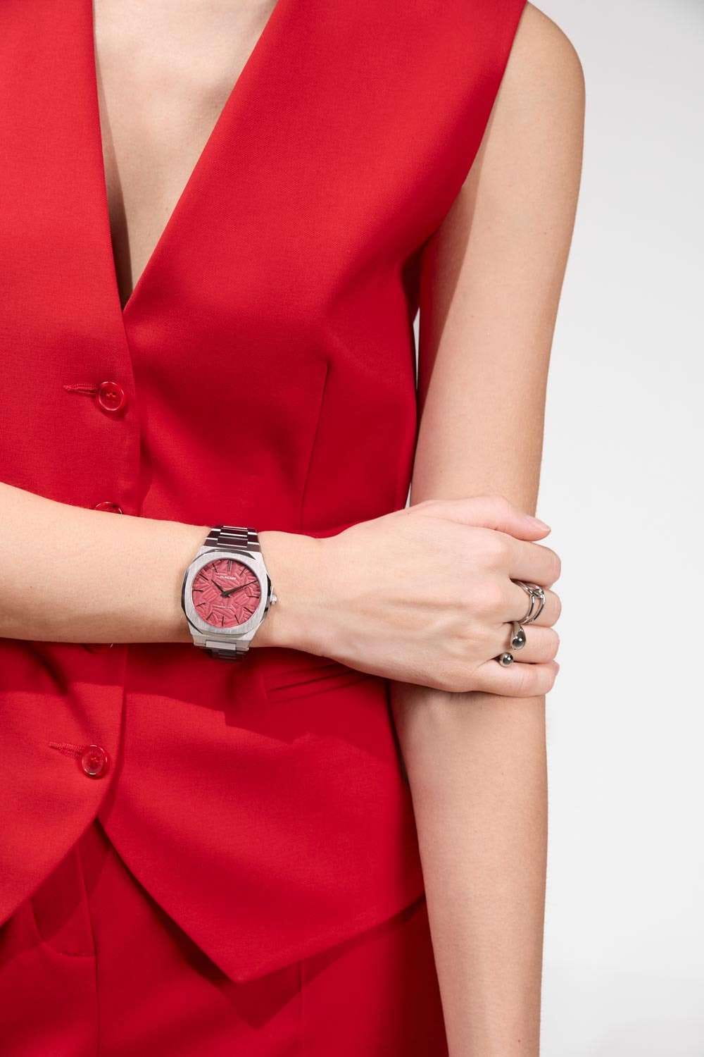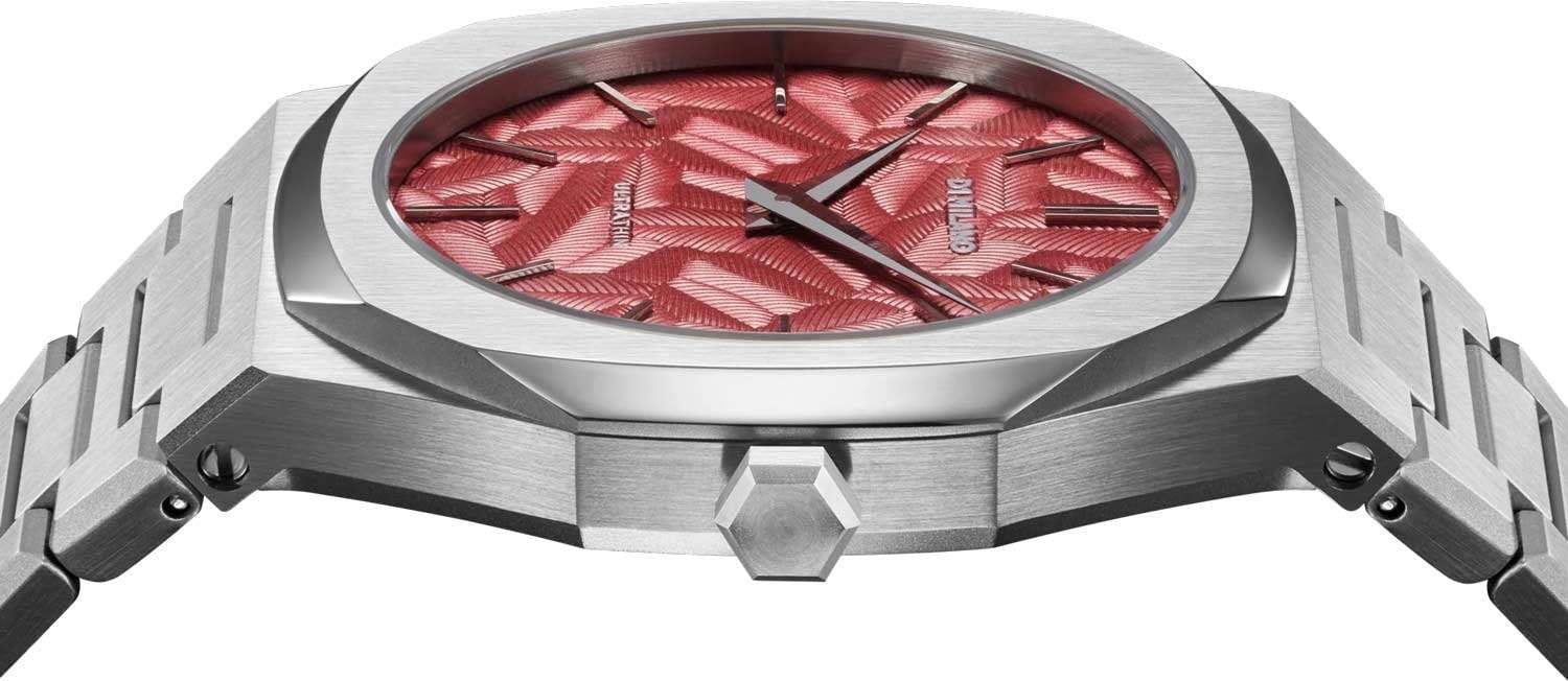 Часы D1 Milano UTBJ33 — это уникальные кварцевые часы, которые подчеркнут ваш изысканный стиль. Эти наручные часы из коллекции Ultra Thin с эффектным монохромным дизайном станут выразительным акцентом вашего образа. Корпус диаметром 40 мм из нержавеющей стали придает часам современный и утонченный вид. Циферблат красного цвета выполнен в виде фигурного узора, напоминающего листья, а серебристые хроматические стрелки и индексы создают стильный контраст, подчёркивая элегантность модели. Задняя крышка из нержавеющей стали закреплена на 8-х винтах и дополнена индивидуальным серийным номером, что подчеркивает уникальность каждого экземпляра. Стальной браслет с раскладной застёжкойРаскладная застёжкаТакой тип застёжки используется только на браслетах из металла. Она никогда не раскрывается полностью, происходит разделение на 2 и более частей. Раскладывающая застёжка снизит вероятность потери часов к минимуму. обеспечивает надежность и комфорт в повседневном использовании. Сапфировое стеклоСапфировое стеклоПрочный и надёжный материал из кристалла сапфира синтетического происхождения, характеризующийся особой твёрдостью и устойчивостью к царапинам и повреждениям. с антибликовым покрытием защищает циферблат, а водозащита до 50WR делает эти часы практичным выбором для любых условий. Благодаря калибру Miyota GL24, они отличаются точностью и надежностью. Эти итальянские часы представляют собой идеальное сочетание традиционного мастерства и инновационного подхода, воплощая в себе новый взгляд на классическую элегантность.