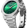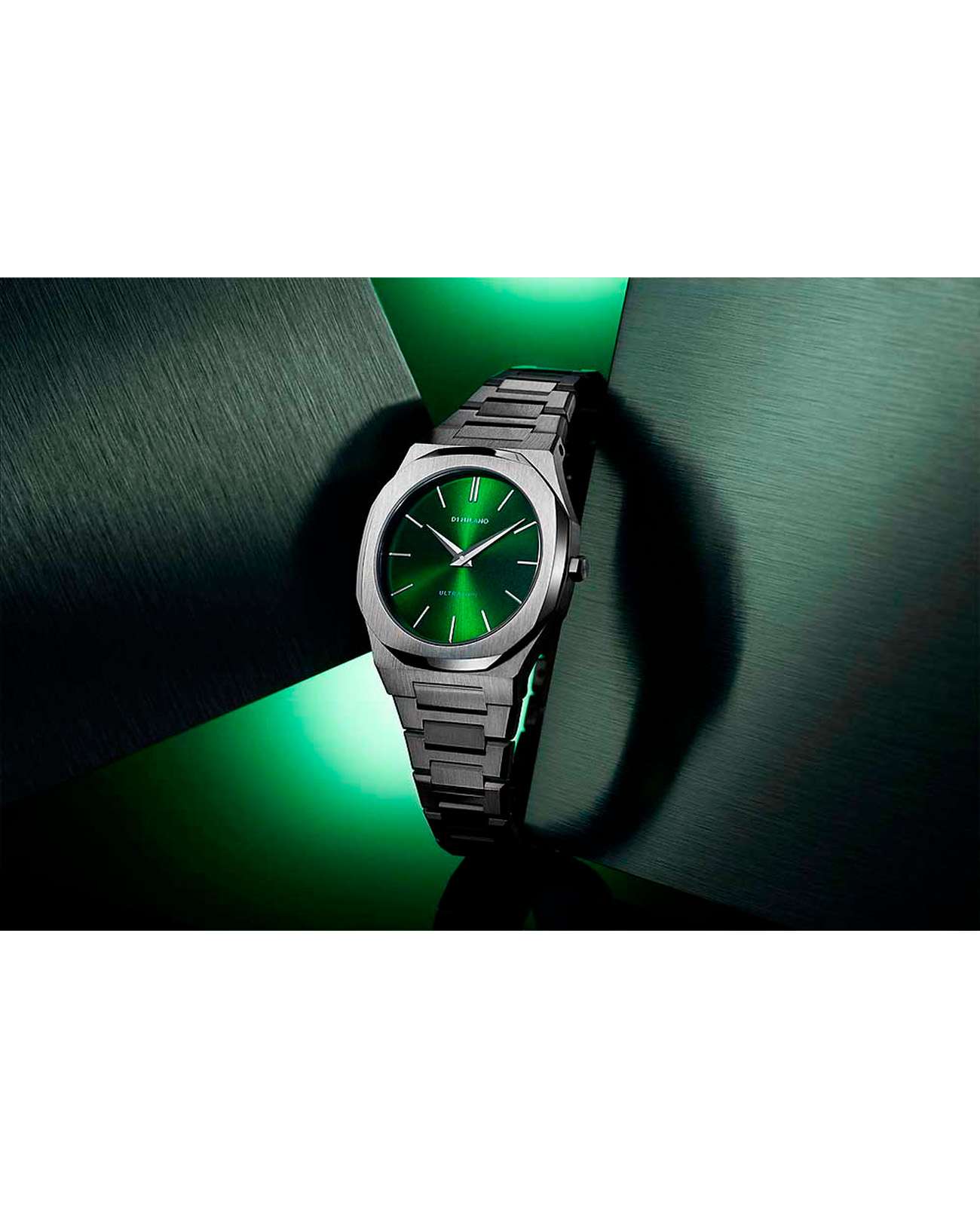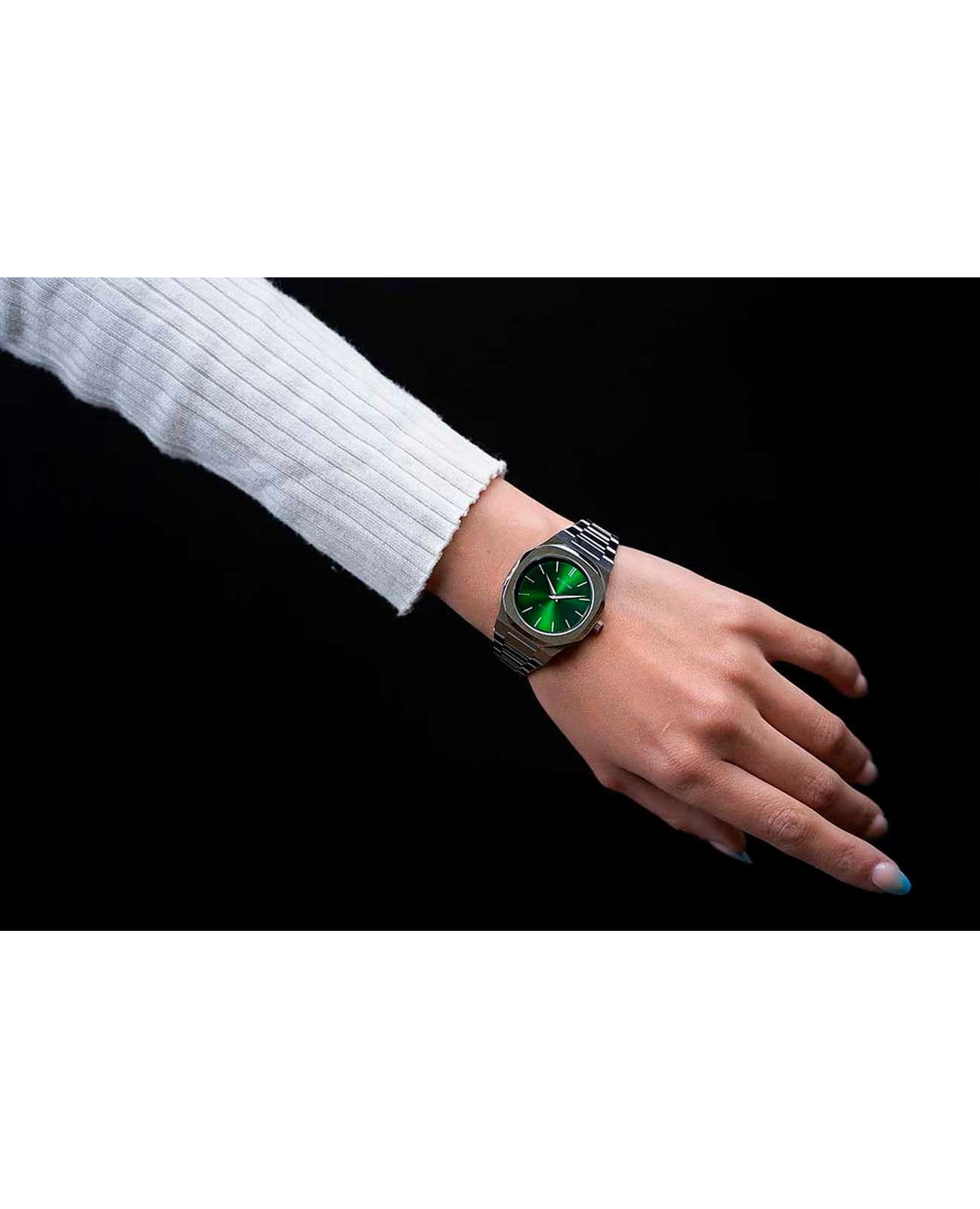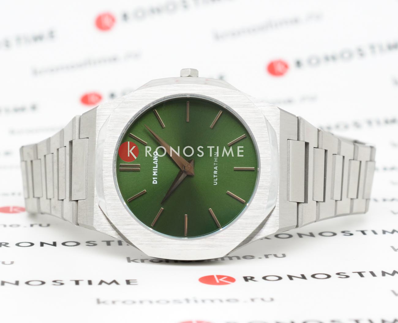 Женские наручные часы D1 Milano UTBL11 из коллекции Ultra Thin сочетают в себе элегантный дизайн и современные технологии. Модель обладает круглым корпусом диаметром 34 мм, изготовленным из высококачественной нержавеющей стали. Толщина ультратонкого корпуса составляет всего 6 мм, делая аксессуар легким и удобным для повседневного использования. Браслет также выполнен из нержавеющей стали с раскладной застежкойРаскладной замокДанный вариант застежки используется только на часах с металлическим браслетом. Отличительная особенность такого крепления в том, что длина браслета становится универсальной и вы можете самостоятельно отрегулировать нужный вам размер – застежка просто двигается по браслету часов., гарантирующей комфортное ношение и безопасность. Циферблат зеленого цвета украшен метками в виде штрихов и оснащен стрелочным механизмом, который подчеркивает элегантность модели. Для защиты используется сапфировое стеклоСапфировое стеклоПрочный и надёжный материал из кристалла сапфира синтетического происхождения, характеризующийся особой твёрдостью и устойчивостью к царапинам и повреждениям. с антибликовым покрытиемАнтибликовое покрытиеСлой оксида металла в 0,13-0,3 микрон, благодаря которому стекло часов не бликует и не отражает свет. Антибликовое покрытие уменьшает отражение света в 10 раз, обеспечивая отличную читаемость показателей циферблата., обеспечивающее прочную защиту от царапин и бликов. Часы работают на кварцевом механизме Miyota 1L22, гарантирующем точность хода без необходимости регулярного подзавода. Водонепроницаемость часов достигает 5 атмосфер (50 метров), что позволяет использовать их во время мытья рук или плавания, однако не рекомендуется для глубоководного дайвинга.
