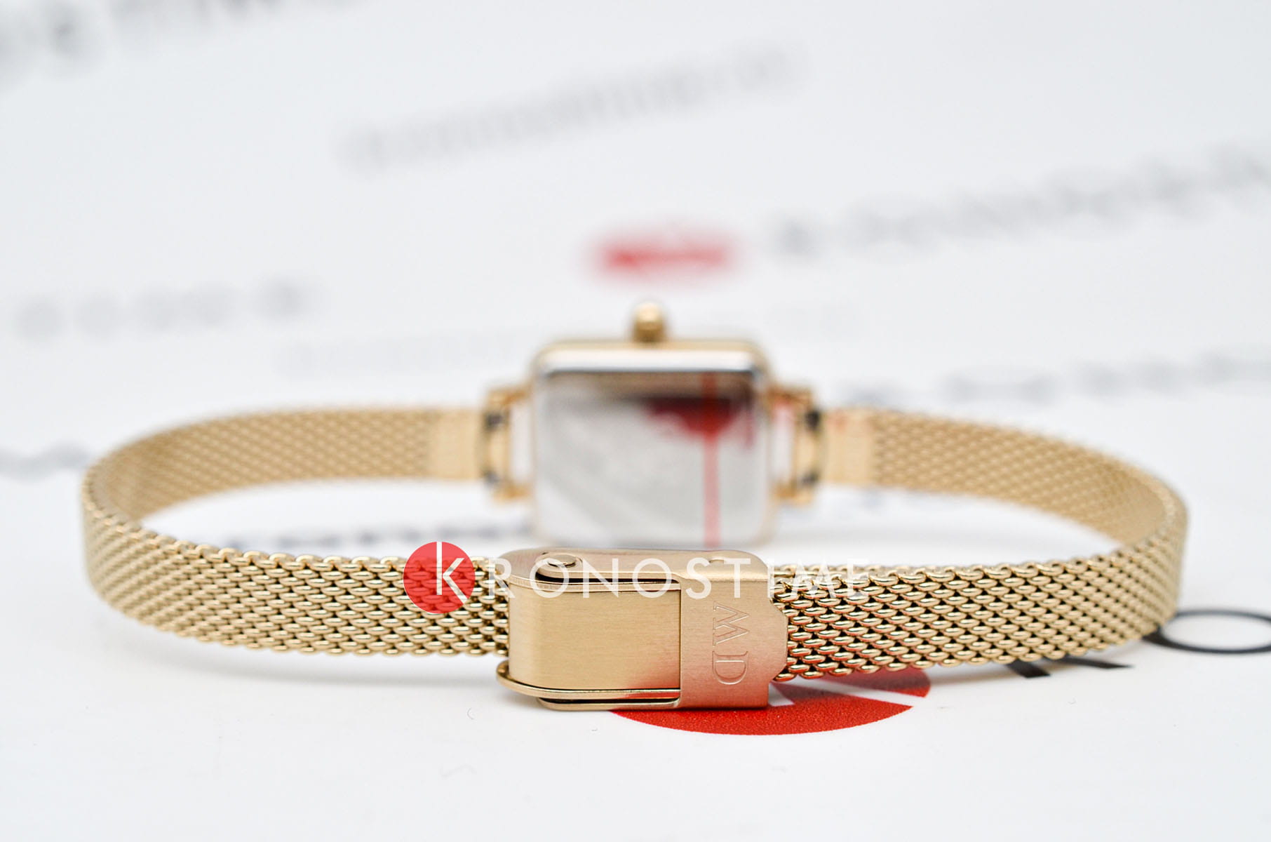 Женские наручные часы с минеральным стекломМинеральное стеклоМинеральное стекло представляет собой искусственно выращенный минерал кварца. Такое стекло отличается особой устойчивостью к повреждениям и царапинам. Уступает по некоторым качествам сапфировому стеклу. Daniel Wellington Quadro DW00100652, кварцевый механизм с высокой точностью. Корпус часов изготовлен из стали с PVD-покрытиемPVDУльтратонкое покрытие наносится в технике вакуумного напыления, сочетает в себе нитрид титана особой прочности со слоем золота или оксида хрома. Несёт в себе декоративную или защитную функцию.. Двухуровневый циферблат выполнен по технологии Sunray (солнечные лучи) и украшен фирменным логотипом Daniel Wellington. Накладные метки в виде штрихов. Рифленая заводная головка. Индивидуальный серийный номер. Класс водозащиты: 30 метров, позволит защитить корпус от случайных брызг или капель дождя. Стальной браслет миланского плетения с PVD-покрытиемPVDУльтратонкое покрытие наносится в технике вакуумного напыления, сочетает в себе нитрид титана особой прочности со слоем золота или оксида хрома. Несёт в себе декоративную или защитную функцию. на раскладном замкеРаскладной замокДанный вариант застежки используется только на часах с металлическим браслетом. Отличительная особенность такого крепления в том, что длина браслета становится универсальной и вы можете самостоятельно отрегулировать нужный вам размер – застежка просто двигается по браслету часов..