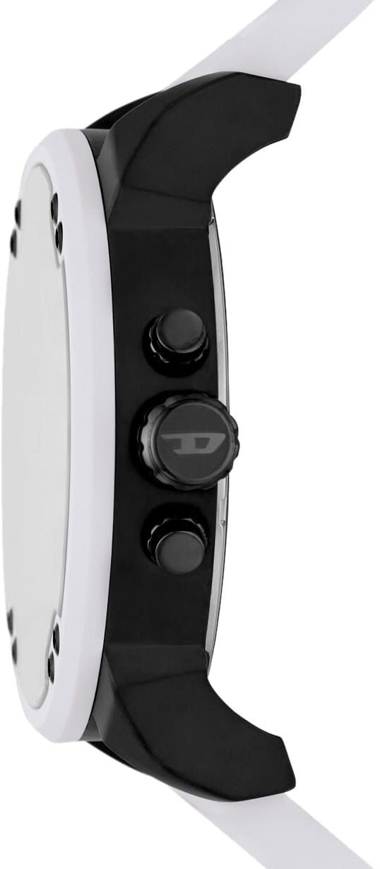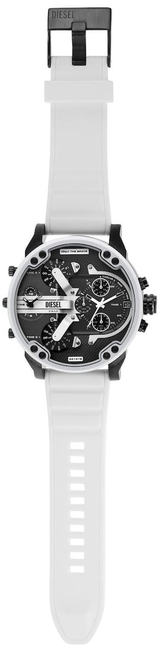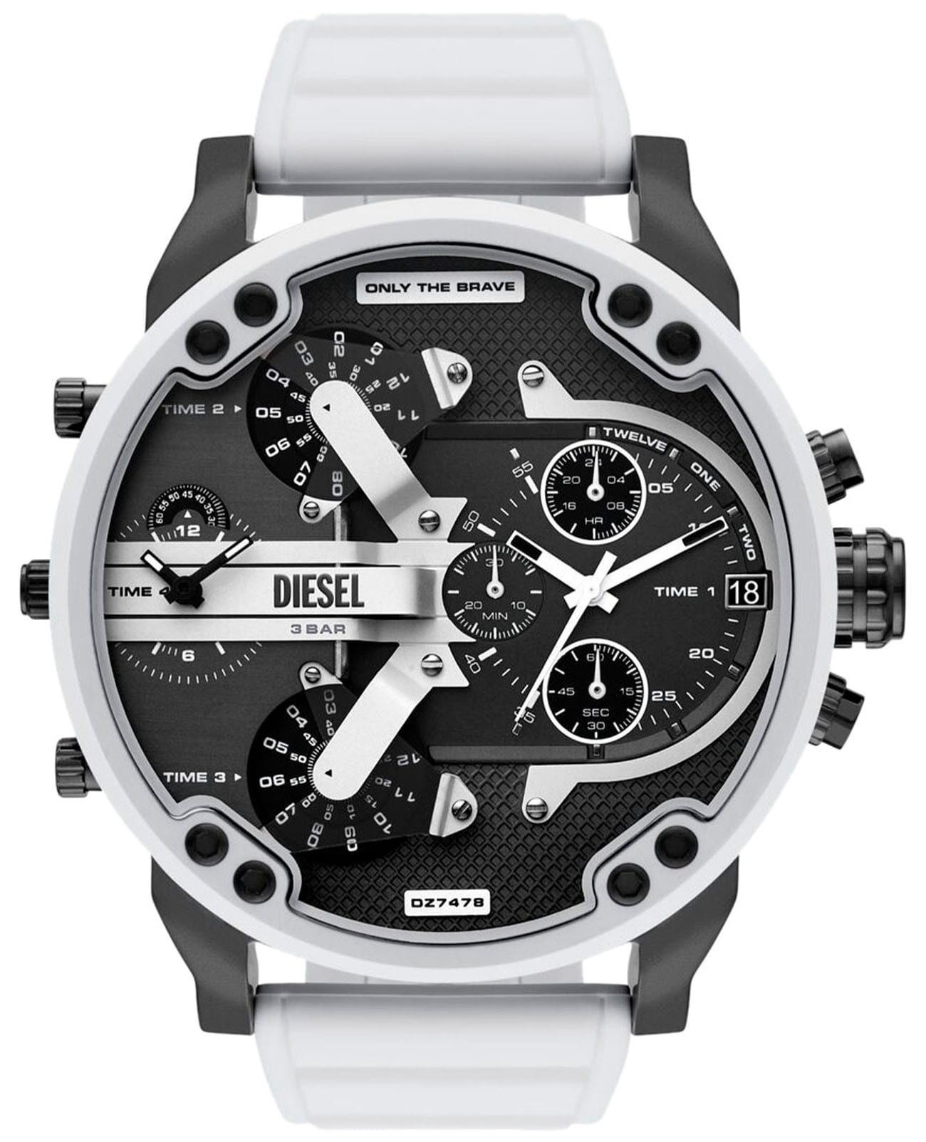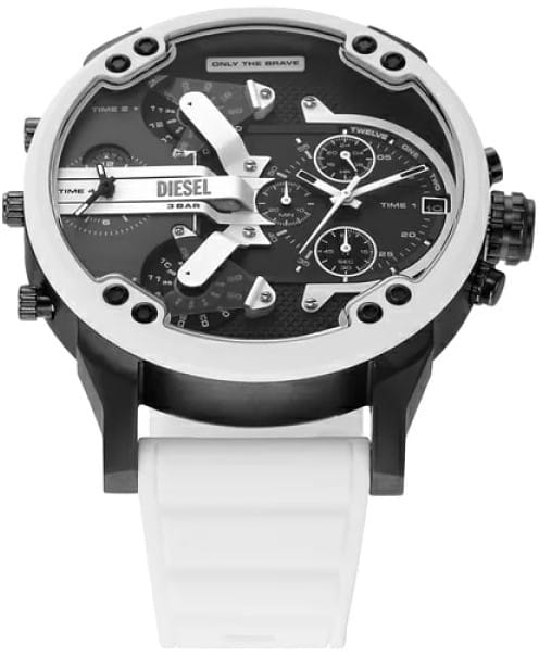 Мужские американские часы-хронографХронографФункция позволяет измерять отрезки времени с особой точностью: часы, минуты, секунды. Верным признаком хронографа является наличие на циферблате 3 дополнительных окошек-счётчиков. с секундомеромСекундомерСекундоме́р — прибор, способный измерять интервалы времени с точностью до долей секунды. Diesel Mr Daddy 2.0 DZ7478, кварцевый механизм с высокой точностью. Класс водозащиты: 30 метров, позволит защитить корпус от случайных брызг или капель дождя. Корпус часов изготовлен из стали с IP-покрытиемIP-покрытиеМетод ионного напыления. Демонстрирует повышенную устойчивость к истиранию, окислению и химическим веществам. Под воздействием высокого давления и температуры около 1500°C молекулы металла надёжно соединяются с частицами корпуса часов.. Силиконовый ремешок на стандартной застёжке. БезельБезельВнешний ободок, закрепляющий стекло. В спортивных часах так называется поворотное кольцо с делениями на циферблате, выполняет роль таймера – замеряет отрезки времени на шкале. Неподвижный безель – элемент декора. Однонаправленно вращающийся безель на дайверских часах позволяет фиксировать моменты погружения и выныривания на поверхность. с IP-покрытиемIP-покрытиеМетод ионного напыления. Демонстрирует повышенную устойчивость к истиранию, окислению и химическим веществам. Под воздействием высокого давления и температуры около 1500°C молекулы металла надёжно соединяются с частицами корпуса часов.. 12-ти и 24-х часовой формат времени. Счетчики на 60 секунд и 30 минут. Окошко даты. Четыре часовых пояса. Четыре механизма, на двух из которых указатели часов и минут в виде вращающихся дисков, на третьем - указатель секунд. Завинчивающаяся задняя крышка.