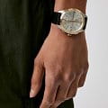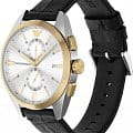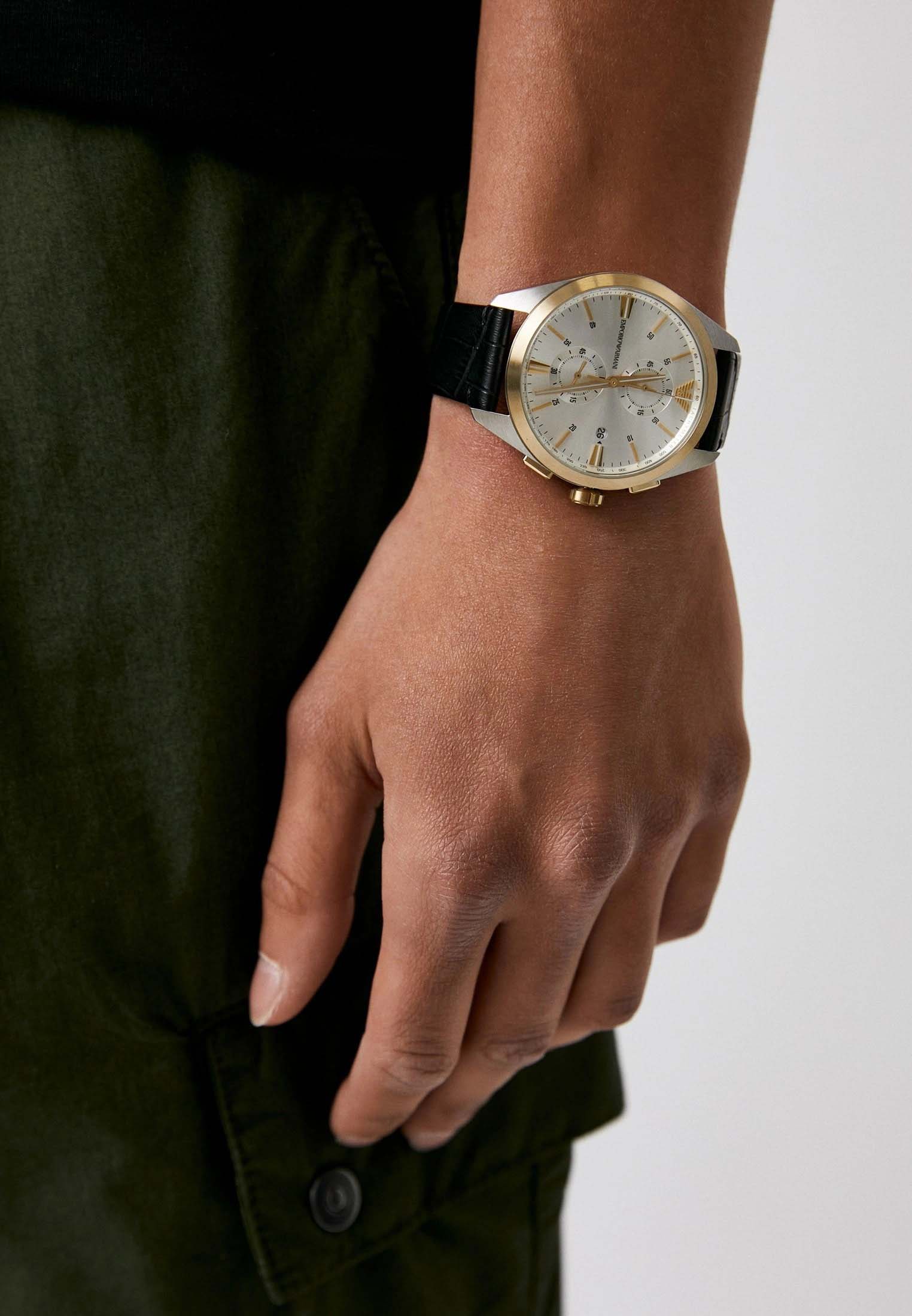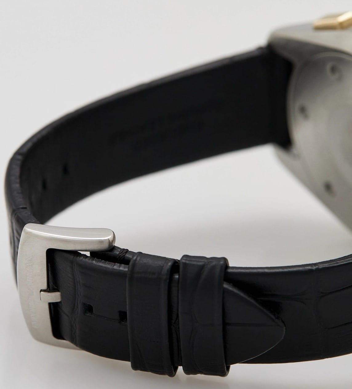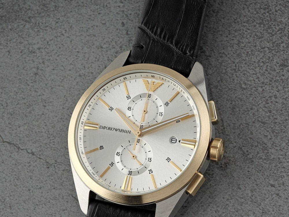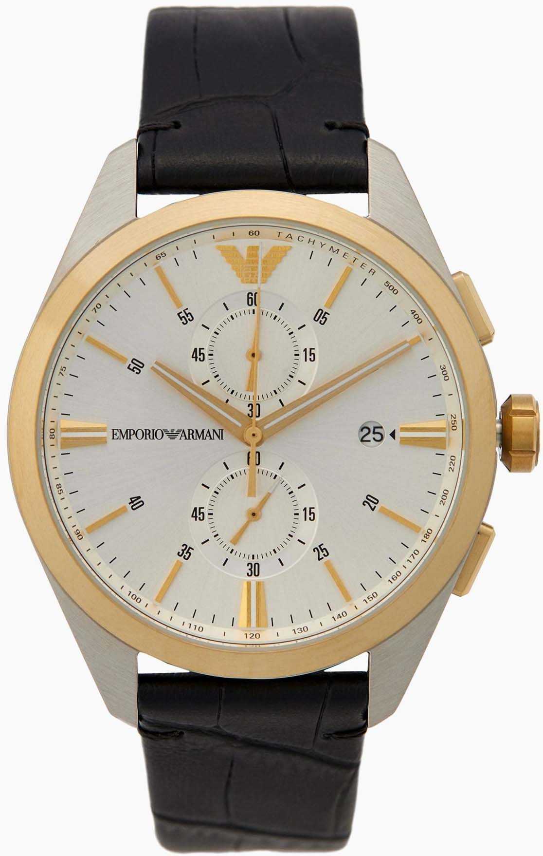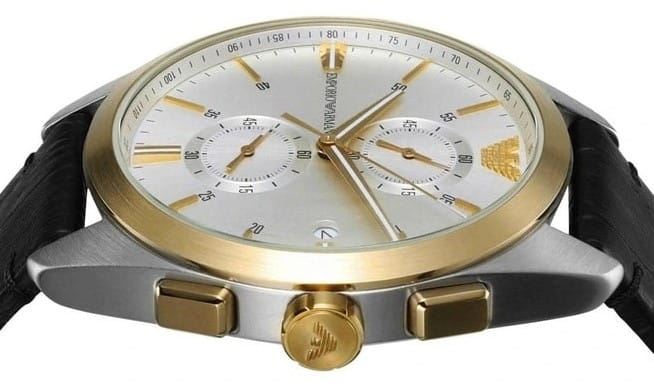 Мужские наручные часы-хронографХронографФункция позволяет измерять отрезки времени с особой точностью: часы, минуты, секунды. Верным признаком хронографа является наличие на циферблате 3 дополнительных окошек-счётчиков. с секундомеромСекундомерСекундоме́р — прибор, способный измерять интервалы времени с точностью до долей секунды. и минеральным стекломМинеральное стеклоМинеральное стекло представляет собой искусственно выращенный минерал кварца. Такое стекло отличается особой устойчивостью к повреждениям и царапинам. Уступает по некоторым качествам сапфировому стеклу. Emporio Armani Claudio AR11498, кварцевый механизм с высокой точностью. Класс водозащиты: 50 метров, позволит защитить корпус от случайных брызг или капель дождя. Корпус часов изготовлен из стали с PVD-покрытиемPVDУльтратонкое покрытие наносится в технике вакуумного напыления, сочетает в себе нитрид титана особой прочности со слоем золота или оксида хрома. Несёт в себе декоративную или защитную функцию.. Кожаный ремешок на стандартной застёжке. БезельБезельВнешний ободок, закрепляющий стекло. В спортивных часах так называется поворотное кольцо с делениями на циферблате, выполняет роль таймера – замеряет отрезки времени на шкале. Неподвижный безель – элемент декора. Однонаправленно вращающийся безель на дайверских часах позволяет фиксировать моменты погружения и выныривания на поверхность. с PVD-покрытиемPVDУльтратонкое покрытие наносится в технике вакуумного напыления, сочетает в себе нитрид титана особой прочности со слоем золота или оксида хрома. Несёт в себе декоративную или защитную функцию.. Окошко даты находится в положении 3 часа. Шкала тахиметраТахиметрРазмеченная шкала, располагается на ободке или безеле часов. Тахиметр позволяет рассчитать скорость на определённом участке пути, расстояние измеряется в километрах или милях. на циферблате. Стрелки и метки с люминесцентным покрытиемЛюминесцентное покрытиеПозволяет считывать показания времени в темноте. Производители наносят на стрелки, часовые индексы, безель или поверхность циферблата светонакопительный состав, дающий холодное свечение..