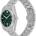 Мужские часы Emporio Armani Federico AR11621 - стильные с кварцевым механизмом сочетают в себе элегантность и функциональность, что делает их идеальным аксессуаром для современного мужчины. Корпус часов из нержавеющей стали, что обеспечивает долговечность и устойчивость к внешним воздействиям. Минеральное стеклоМинеральное стеклоМинеральное стекло представляет собой искусственно выращенный минерал кварца. Такое стекло отличается особой устойчивостью к повреждениям и царапинам. Уступает по некоторым качествам сапфировому стеклу. защищает зеленый циферблат, добавляя изысканности всей конструкции. Размер корпуса составляет 41 мм, а толщина — 10 мм, что придаёт часам солидный внешний вид, не утяжеляя при этом запястье. Часы имеют водонепроницаемость WR50 (5 атм), это позволяет использовать их в повседневной жизни, не опасаясь воздействия воды. Стальной браслет на застежке «бабочка»Застёжка "бабочка"Такой вид застёжки дополняется предохранителями, помогающими избежать случайного раскрытия браслета. Обладают изящным исполнением. обеспечивает комфортное и надёжное крепление на запястье. Функция отображения даты, расположенная на отметке «6 часов», добавляет практичности и удобства в использовании. Стрелки с люминесцентным покрытиемЛюминесцентное покрытиеПозволяет считывать показания времени в темноте. Производители наносят на стрелки, часовые индексы, безель или поверхность циферблата светонакопительный состав, дающий холодное свечение. обеспечивают удобное считывание времени в темноте после кратковременного пребывания на свету, что делает эти часы практичными в любых условиях.