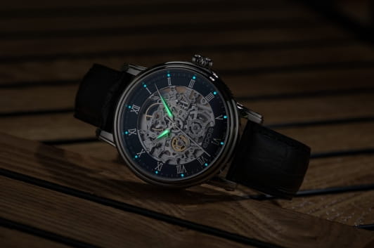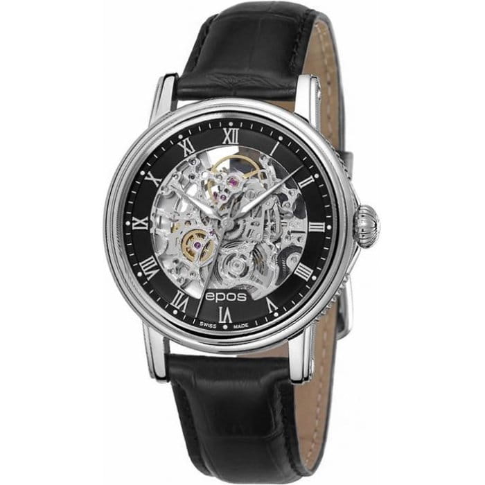 Мужские механические часы с автоподзаводом Epos — это сочетание швейцарского мастерства и современного дизайна. Корпус диаметром 41 мм выполнен из нержавеющей стали 316L. Циферблат чёрного цвета частично скелетонизирован, оформлен римскими цифрами и дополнен гильошированным узором. Циферблат защищён сапфировым стекломСапфировое стеклоПрочный и надёжный материал из кристалла сапфира синтетического происхождения, характеризующийся особой твёрдостью и устойчивостью к царапинам и повреждениям.. Стрелки и метки с люминесцентным покрытиемЛюминесцентное покрытиеПозволяет считывать показания времени в темноте. Производители наносят на стрелки, часовые индексы, безель или поверхность циферблата светонакопительный состав, дающий холодное свечение., обеспечивающим хорошую читаемость в темноте. Механизм — швейцарский калибр ETA 2892, декорированный вручную. Прозрачная задняя крышка позволяет наблюдать за работой механизма. Заводная головка — завинчивающаяся. Часы оснащены кожаным ремешком чёрного цвета с стандартной застёжкой. Водонепроницаемость 50 м позволяет использовать часы в повседневных условиях, защищая от случайных брызг и капель дождя. Гарантия — 24 месяца. Универсальный выбор для ценителя механики и элегантного стиля.