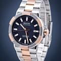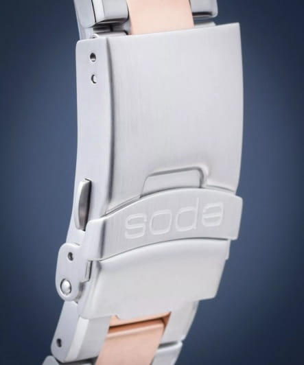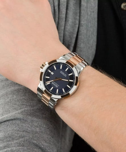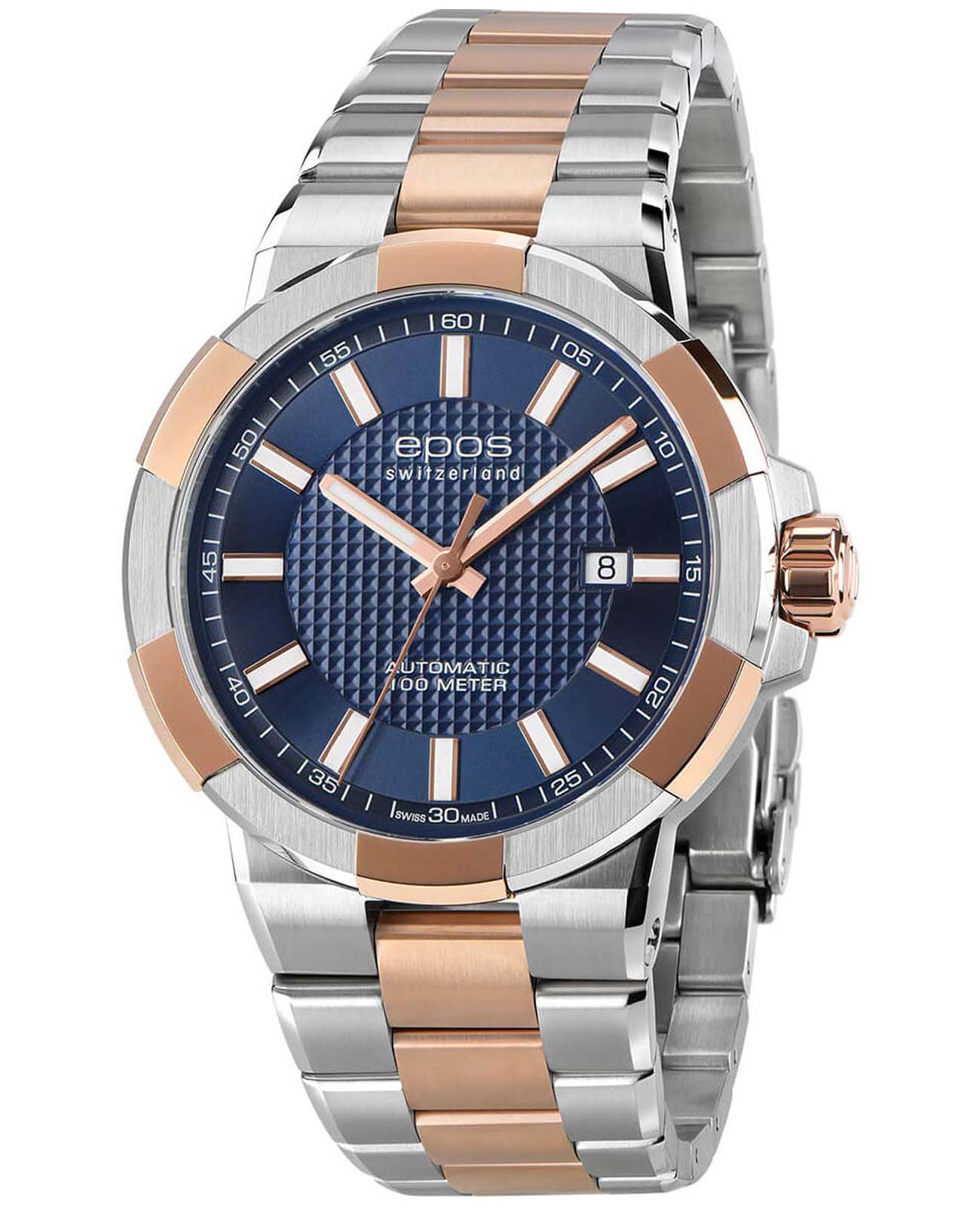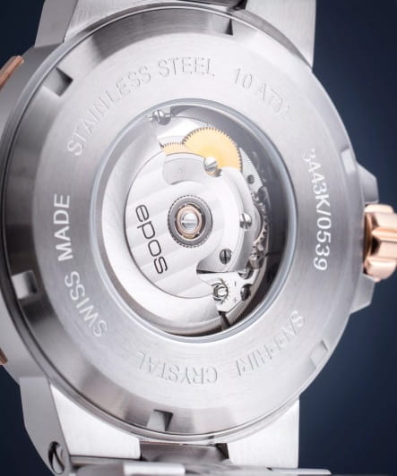 Мужские механические часы с автоподзаводом Epos из коллекции Sportive — это стильный аксессуар с швейцарским качеством и современным дизайном. Корпус диаметром 43,8 мм и толщиной 11 мм выполнен из нержавеющей стали 316L с PVD-покрытиемPVDУльтратонкое покрытие наносится в технике вакуумного напыления, сочетает в себе нитрид титана особой прочности со слоем золота или оксида хрома. Несёт в себе декоративную или защитную функцию.. Циферблат синего цвета оформлен метками и стрелками с люминесцентным покрытиемЛюминесцентное покрытиеПозволяет считывать показания времени в темноте. Производители наносят на стрелки, часовые индексы, безель или поверхность циферблата светонакопительный состав, дающий холодное свечение., обеспечивающим хорошую читаемость в темноте. Циферблат защищён сапфировым стекломСапфировое стеклоПрочный и надёжный материал из кристалла сапфира синтетического происхождения, характеризующийся особой твёрдостью и устойчивостью к царапинам и повреждениям.. Механизм — швейцарский калибр ETA 2824 с запасом хода 38 часов. Окошко даты расположено в положении 3 часов. Прозрачная задняя крышка позволяет наблюдать за работой декорированного механизма. Часы оснащены стальным браслетом комбинированного цвета на раскладной застёжкеРаскладная застёжкаТакой тип застёжки используется только на браслетах из металла. Она никогда не раскрывается полностью, происходит разделение на 2 и более частей. Раскладывающая застёжка снизит вероятность потери часов к минимуму.. Водонепроницаемость 100 м позволяет использовать часы для плавания и повседневного ношения. Гарантия — 24 месяца. Универсальный выбор для ценителя механики и элегантного стиля.