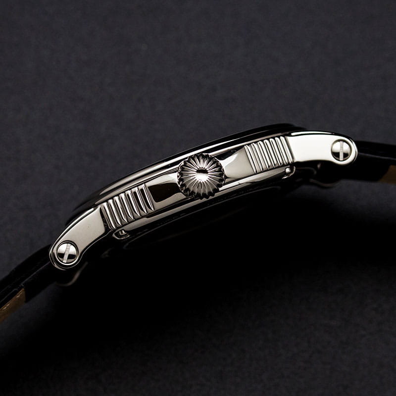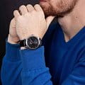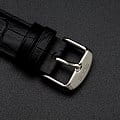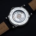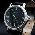 черным гильоше. Стрелки и метки с люминесцентной подсветкойЛюминесцентное покрытиеПозволяет считывать показания времени в темноте. Производители наносят на стрелки, часовые индексы, безель или поверхность циферблата светонакопительный состав, дающий холодное свечение.. Окошко даты находится в положении 6 часов. Прозрачная задняя крышка. Класс водозащиты: 50 метров, позволит защитить корпус от случайных брызг или капель дождя. Кожаный ремешок на стандартной застёжке.