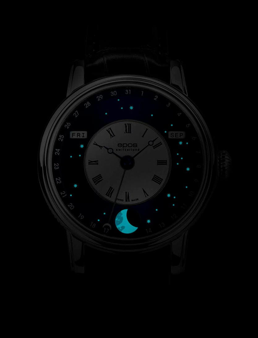 Мужские швейцарские механические часы с автоподзаводом Epos Oeuvre d'art 3439.322.20.26.25. Сапфировое стеклоСапфировое стеклоПрочный и надёжный материал из кристалла сапфира синтетического происхождения, характеризующийся особой твёрдостью и устойчивостью к царапинам и повреждениям. устойчивое к появлению царапин, обладающее высокой прозрачностью. Корпус часов изготовлен из нержавеющей стали. В механизме 25 камней, частота 28800 полуколебаний в час. Запас хода 42 часа. Механизм декорирован узором Cotes de Geneve. Циферблат выполнен по технологии Sunray (солнечные лучи). В центре циферблат дополнен изображением ночного неба со светящимися звездами и большой светящейся луной с люминесцентной подсветкойЛюминесцентное покрытиеПозволяет считывать показания времени в темноте. Производители наносят на стрелки, часовые индексы, безель или поверхность циферблата светонакопительный состав, дающий холодное свечение.. Накладные метки в виде штрихов. Дата отображается центральной стрелкой. Окошко дня недели и месяца. Автоматический указатель фазы луны. Винтажная заводная головка. Прозрачная задняя крышка. Класс водозащиты: 50 метров, позволит защитить корпус от случайных брызг или капель дождя. Кожаный ремешок на стандартной застёжке.