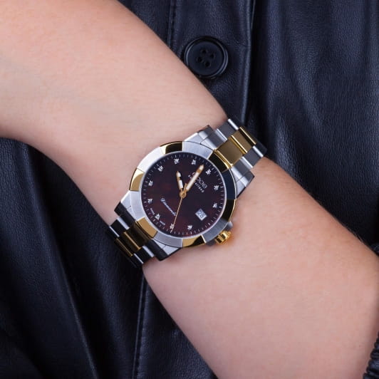 Женские кварцевые часы Epos из коллекции Ladies Diamonds — это элегантный аксессуар, сочетающий швейцарское качество и изысканный дизайн. Корпус диаметром 36 мм и толщиной 9 мм выполнен из нержавеющей стали 316L, безель с частичным PVD-покрытиемPVDУльтратонкое покрытие наносится в технике вакуумного напыления, сочетает в себе нитрид титана особой прочности со слоем золота или оксида хрома. Несёт в себе декоративную или защитную функцию. розового золота. Циферблат с перламутровой вставкой тёмного оттенка выполнен по технологии «солнечные лучи» и украшен синтетическими бриллиантами. Циферблат защищён сапфировым стекломСапфировое стеклоПрочный и надёжный материал из кристалла сапфира синтетического происхождения, характеризующийся особой твёрдостью и устойчивостью к царапинам и повреждениям.. Метки в виде точек инкрустированы бриллиантами. Стрелки с люминесцентным покрытиемЛюминесцентное покрытиеПозволяет считывать показания времени в темноте. Производители наносят на стрелки, часовые индексы, безель или поверхность циферблата светонакопительный состав, дающий холодное свечение., обеспечивающим хорошую читаемость в темноте. Окошко даты расположено в положении 3 часов. Механизм — швейцарский кварцевый калибр Ronda 705. Часы оснащены стальным браслетом комбинированного цвета на раскладной застёжкеРаскладная застёжкаТакой тип застёжки используется только на браслетах из металла. Она никогда не раскрывается полностью, происходит разделение на 2 и более частей. Раскладывающая застёжка снизит вероятность потери часов к минимуму.. Водонепроницаемость 50 м позволяет использовать часы в повседневных условиях.