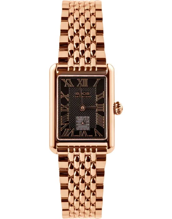 Epos 8002.702.24.25.34 — женская модель с утончённым классическим стилем и прямоугольным корпусом, выполненным из нержавеющей стали с PVD-покрытиемPVDУльтратонкое покрытие наносится в технике вакуумного напыления, сочетает в себе нитрид титана особой прочности со слоем золота или оксида хрома. Несёт в себе декоративную или защитную функцию.. Черный циферблат оформлен римскими индексами и утончённым узором «Clous de Paris», создающим игру света и подчёркивающим глубину дизайна. Защитную функцию выполняет сапфировое стеклоСапфировое стеклоПрочный и надёжный материал из кристалла сапфира синтетического происхождения, характеризующийся особой твёрдостью и устойчивостью к царапинам и повреждениям., стойкое к царапинам и сохраняющее прозрачность. В основе лежит швейцарский автоматический механизм, обеспечивающий стабильность и точность хода. Функции включают индикацию часов, минут и малую секундную шкалу, расположенную в позиции «6 часов». Стальной браслетс PVD-покрытиемPVDУльтратонкое покрытие наносится в технике вакуумного напыления, сочетает в себе нитрид титана особой прочности со слоем золота или оксида хрома. Несёт в себе декоративную или защитную функцию. на раскладной застёжкеРаскладная застёжкаТакой тип застёжки используется только на браслетах из металла. Она никогда не раскрывается полностью, происходит разделение на 2 и более частей. Раскладывающая застёжка снизит вероятность потери часов к минимуму., которая гармонично завершает строгий образ модели.