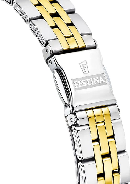 Женские часы Festina F16868/3. Корпус часов изготовлен из нержавеющей стали с PVD-покрытиемPVDУльтратонкое покрытие наносится в технике вакуумного напыления, сочетает в себе нитрид титана особой прочности со слоем золота или оксида хрома. Несёт в себе декоративную или защитную функцию.. Минеральное стеклоМинеральное стеклоМинеральное стекло представляет собой искусственно выращенный минерал кварца. Такое стекло отличается особой устойчивостью к повреждениям и царапинам. Уступает по некоторым качествам сапфировому стеклу. устойчивое к мелким механическим повреждениям. Класс водозащиты: 50 метров, позволит защитить корпус от случайных брызг или капель дождя. Стальной браслет с PVD-покрытиемPVDУльтратонкое покрытие наносится в технике вакуумного напыления, сочетает в себе нитрид титана особой прочности со слоем золота или оксида хрома. Несёт в себе декоративную или защитную функцию. на раскладной застёжкеРаскладная застёжкаТакой тип застёжки используется только на браслетах из металла. Она никогда не раскрывается полностью, происходит разделение на 2 и более частей. Раскладывающая застёжка снизит вероятность потери часов к минимуму.. Неподвижный безельБезельВнешний ободок, закрепляющий стекло. В спортивных часах так называется поворотное кольцо с делениями на циферблате, выполняет роль таймера – замеряет отрезки времени на шкале. Неподвижный безель – элемент декора. Однонаправленно вращающийся безель на дайверских часах позволяет фиксировать моменты погружения и выныривания на поверхность. с фианитами.