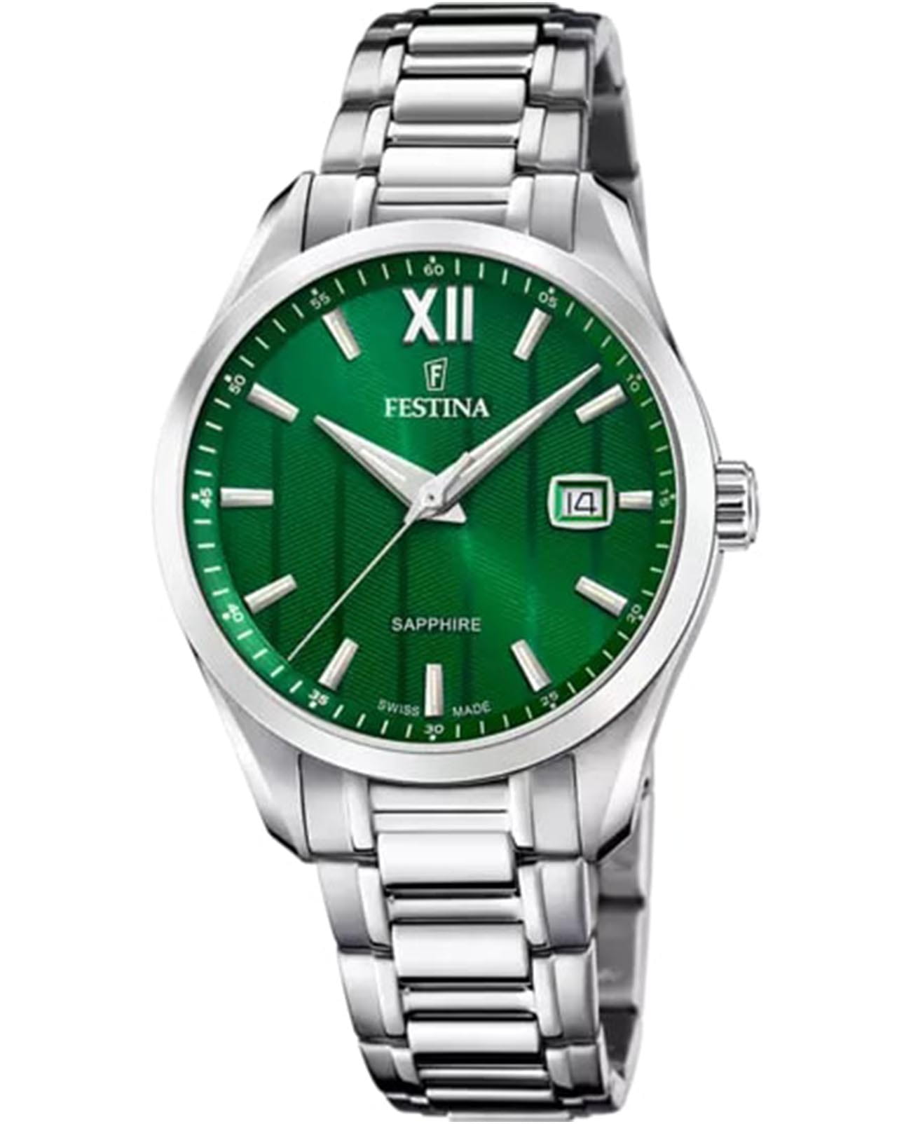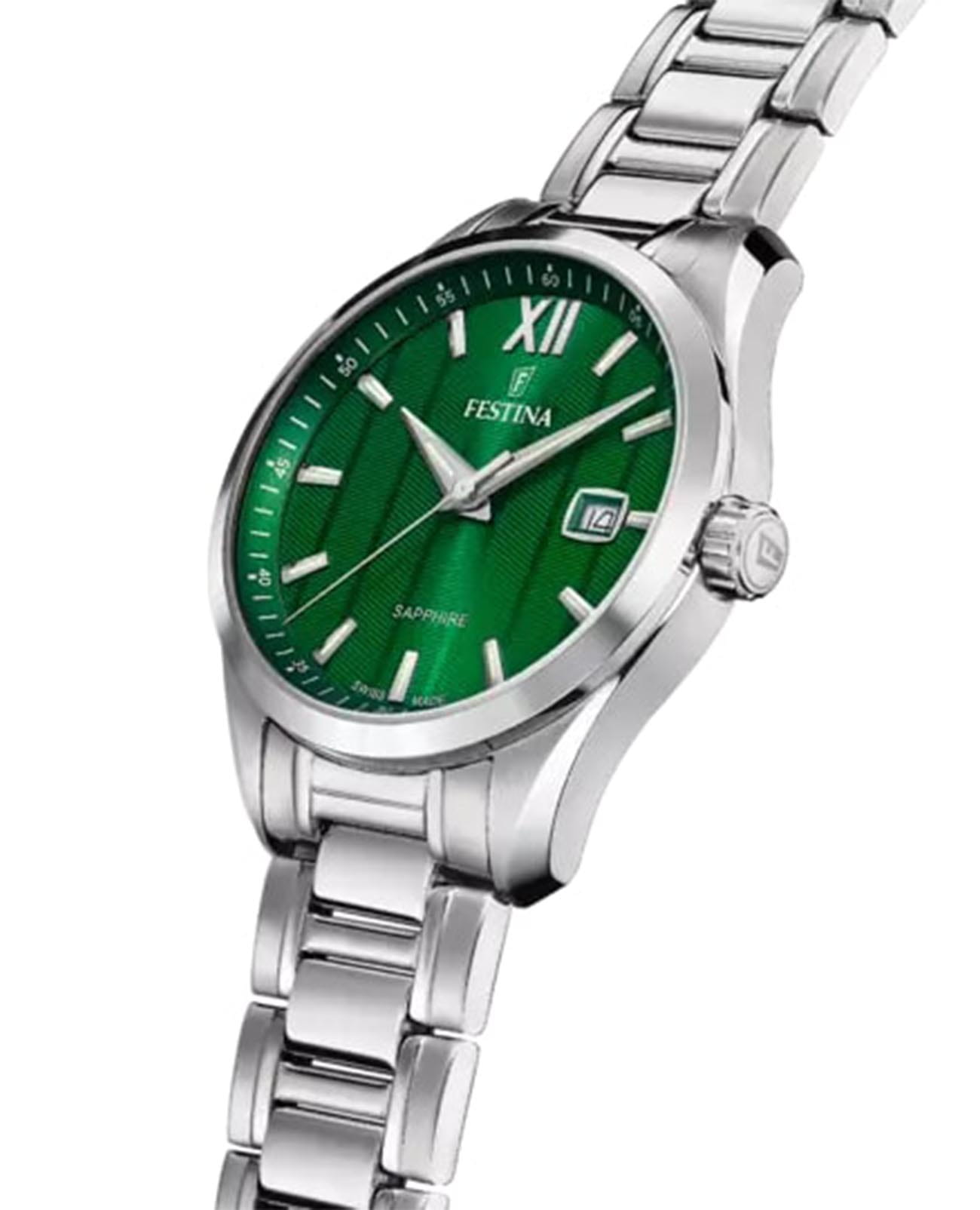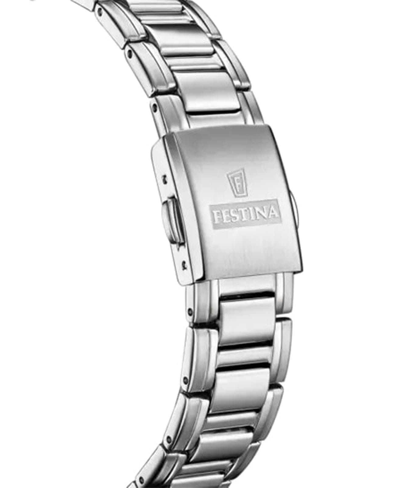 Практичные и стильные часы Festina F20026/3 с круглым корпусом на стальном браслете идеальны для современного ритма жизни. Кварцевый механизм с высокой точностью. Сапфировое стеклоСапфировое стеклоПрочный и надёжный материал из кристалла сапфира синтетического происхождения, характеризующийся особой твёрдостью и устойчивостью к царапинам и повреждениям. устойчивое к появлению царапин, обладающее высокой прозрачностью. Класс водозащиты: 50 метров, позволит защитить корпус от случайных брызг или капель дождя. Корпус часов изготовлен из нержавеющей стали. Браслет с раскладной застёжкойРаскладная застёжкаТакой тип застёжки используется только на браслетах из металла. Она никогда не раскрывается полностью, происходит разделение на 2 и более частей. Раскладывающая застёжка снизит вероятность потери часов к минимуму.. Стрелки с люминесцентным покрытиемЛюминесцентное покрытиеПозволяет считывать показания времени в темноте. Производители наносят на стрелки, часовые индексы, безель или поверхность циферблата светонакопительный состав, дающий холодное свечение.. Окошко даты находится в положении 3 часа.