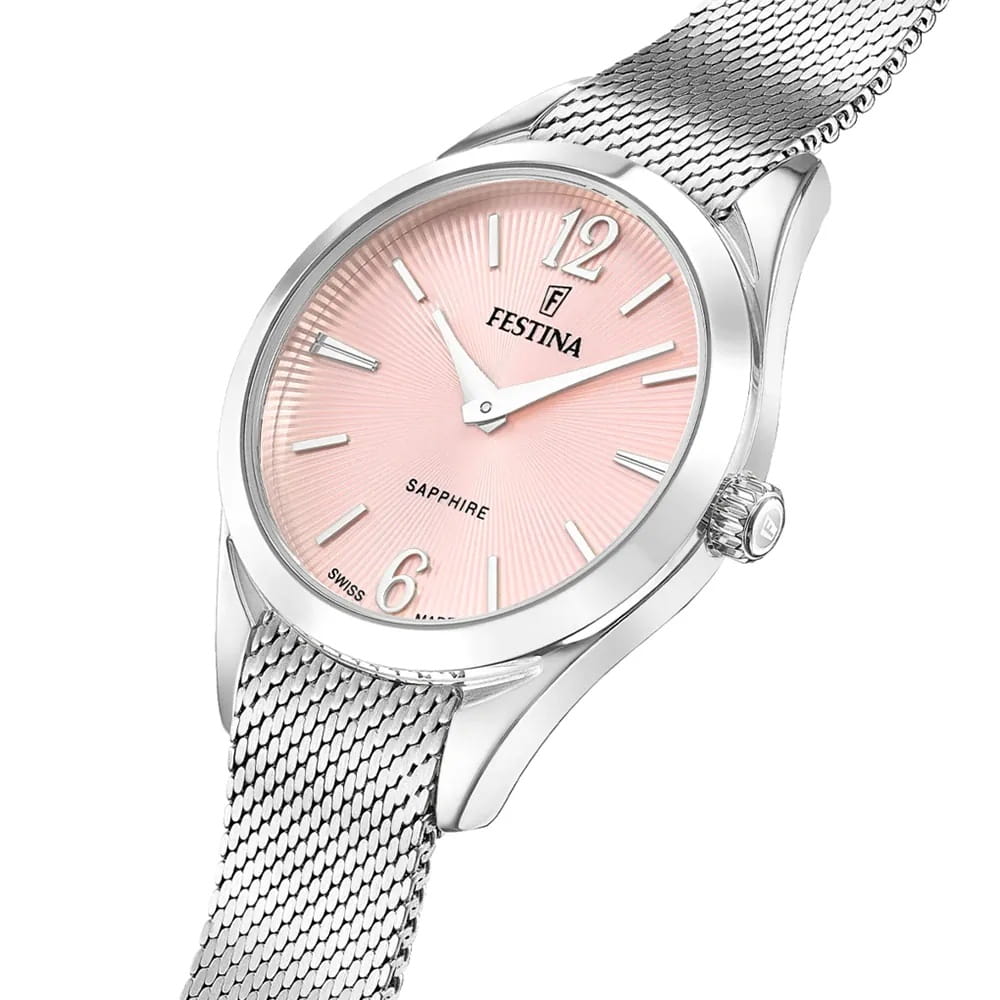 Женские кварцевые часы Festina F20076/2 из коллекции Swiss Made — это элегантный аксессуар с швейцарским качеством и изысканным дизайном. Корпус диаметром 32 мм и толщиной 7,3 мм выполнен из нержавеющей стали серебряного цвета. Циферблат розового цвета оформлен минималистично, с тонкими метками. Циферблат защищён сапфировым стекломСапфировое стеклоПрочный и надёжный материал из кристалла сапфира синтетического происхождения, характеризующийся особой твёрдостью и устойчивостью к царапинам и повреждениям.. Заводная головка — вытягивающегося типа, задняя крышка — прижимная. Часы оснащены стальным браслетом миланского плетения с раскладным замкомРаскладной замокДанный вариант застежки используется только на часах с металлическим браслетом. Отличительная особенность такого крепления в том, что длина браслета становится универсальной и вы можете самостоятельно отрегулировать нужный вам размер – застежка просто двигается по браслету часов.. Механизм — кварцевый калибр Ronda 762 с 10-летним сроком службы батареи. Водонепроницаемость 50 м позволяет использовать часы в повседневных условиях, защищая от брызг и дождя. Универсальный выбор для тех, кто ценит лаконичность, стиль и долговечность.