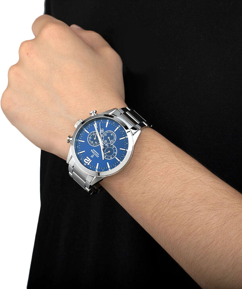 Эксклюзивный хронографХронографФункция позволяет измерять отрезки времени с особой точностью: часы, минуты, секунды. Верным признаком хронографа является наличие на циферблате 3 дополнительных окошек-счётчиков. с секундомеромСекундомерСекундоме́р — прибор, способный измерять интервалы времени с точностью до долей секунды., отличающийся продуманным дизайном и отделкой, придется по вкусу мужчинам, ценящим идеальное соотношение цены и качества.. Минеральное стеклоМинеральное стеклоМинеральное стекло представляет собой искусственно выращенный минерал кварца. Такое стекло отличается особой устойчивостью к повреждениям и царапинам. Уступает по некоторым качествам сапфировому стеклу. устойчивое к появлению царапин, обладающее высокой прозрачностью. Класс водозащиты: 50 метров, позволит защитить корпус от случайных брызг или капель дождя. Метки в виде штрихов. Стрелки и метки с нанесенным люминесцентным покрытиемЛюминесцентное покрытиеПозволяет считывать показания времени в темноте. Производители наносят на стрелки, часовые индексы, безель или поверхность циферблата светонакопительный состав, дающий холодное свечение.