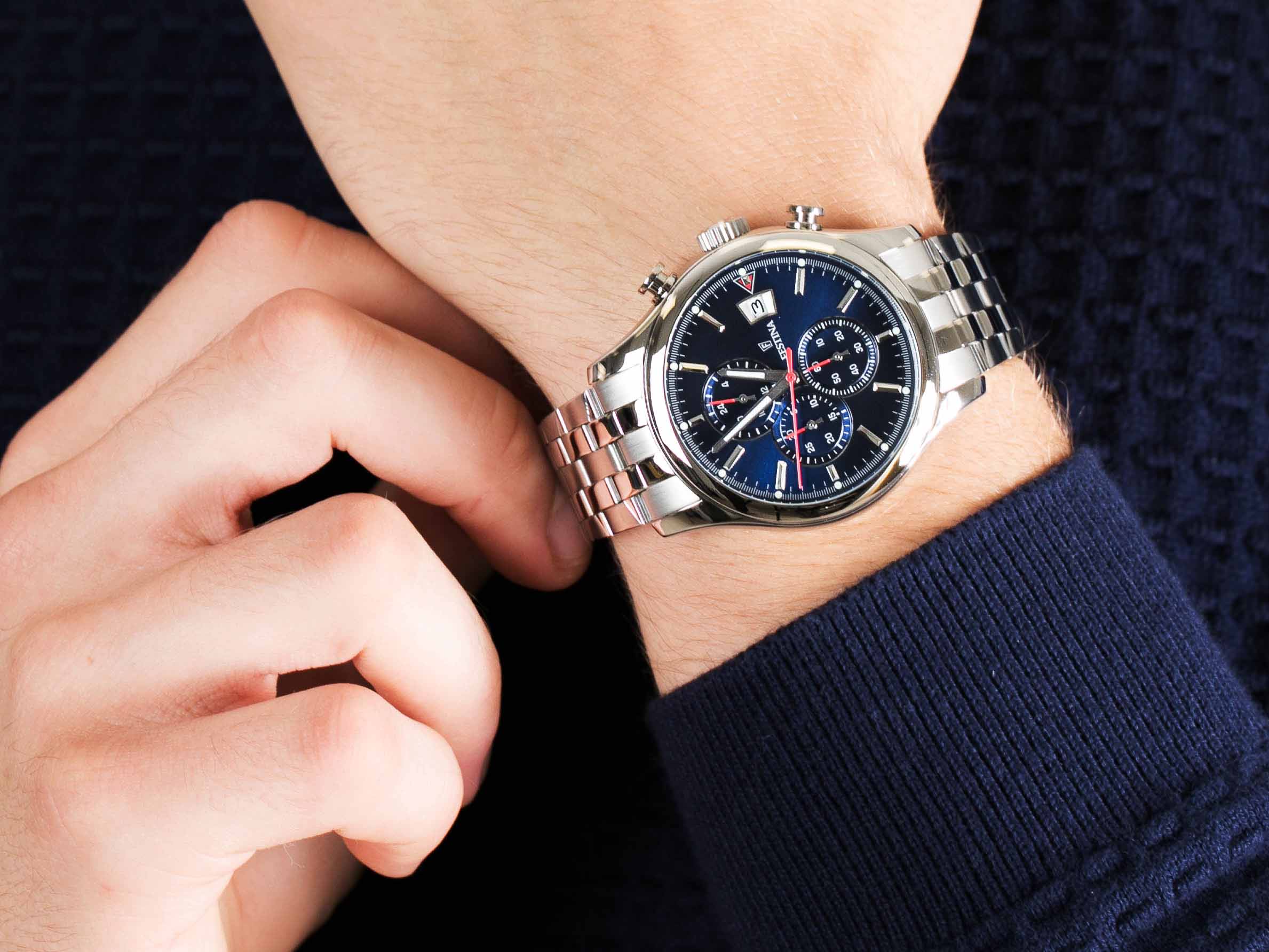 Эксклюзивный хронографХронографФункция позволяет измерять отрезки времени с особой точностью: часы, минуты, секунды. Верным признаком хронографа является наличие на циферблате 3 дополнительных окошек-счётчиков. с секундомеромСекундомерСекундоме́р — прибор, способный измерять интервалы времени с точностью до долей секунды., отличающийся продуманным дизайном и отделкой, придется по вкусу мужчинам, ценящим идеальное соотношение цены и качества.. Минеральное стеклоМинеральное стеклоМинеральное стекло представляет собой искусственно выращенный минерал кварца. Такое стекло отличается особой устойчивостью к повреждениям и царапинам. Уступает по некоторым качествам сапфировому стеклу. устойчивое к появлению царапин, обладающее высокой прозрачностью. Циферблат с люминесцентным покрытиемЛюминесцентное покрытиеПозволяет считывать показания времени в темноте. Производители наносят на стрелки, часовые индексы, безель или поверхность циферблата светонакопительный состав, дающий холодное свечение. стрелок и меток. Класс водозащиты: 100 метров, позволит защитить корпус от случайных брызг или капель дождя. Браслет с раскладной застёжкойРаскладная застёжкаТакой тип застёжки используется только на браслетах из металла. Она никогда не раскрывается полностью, происходит разделение на 2 и более частей. Раскладывающая застёжка снизит вероятность потери часов к минимуму..