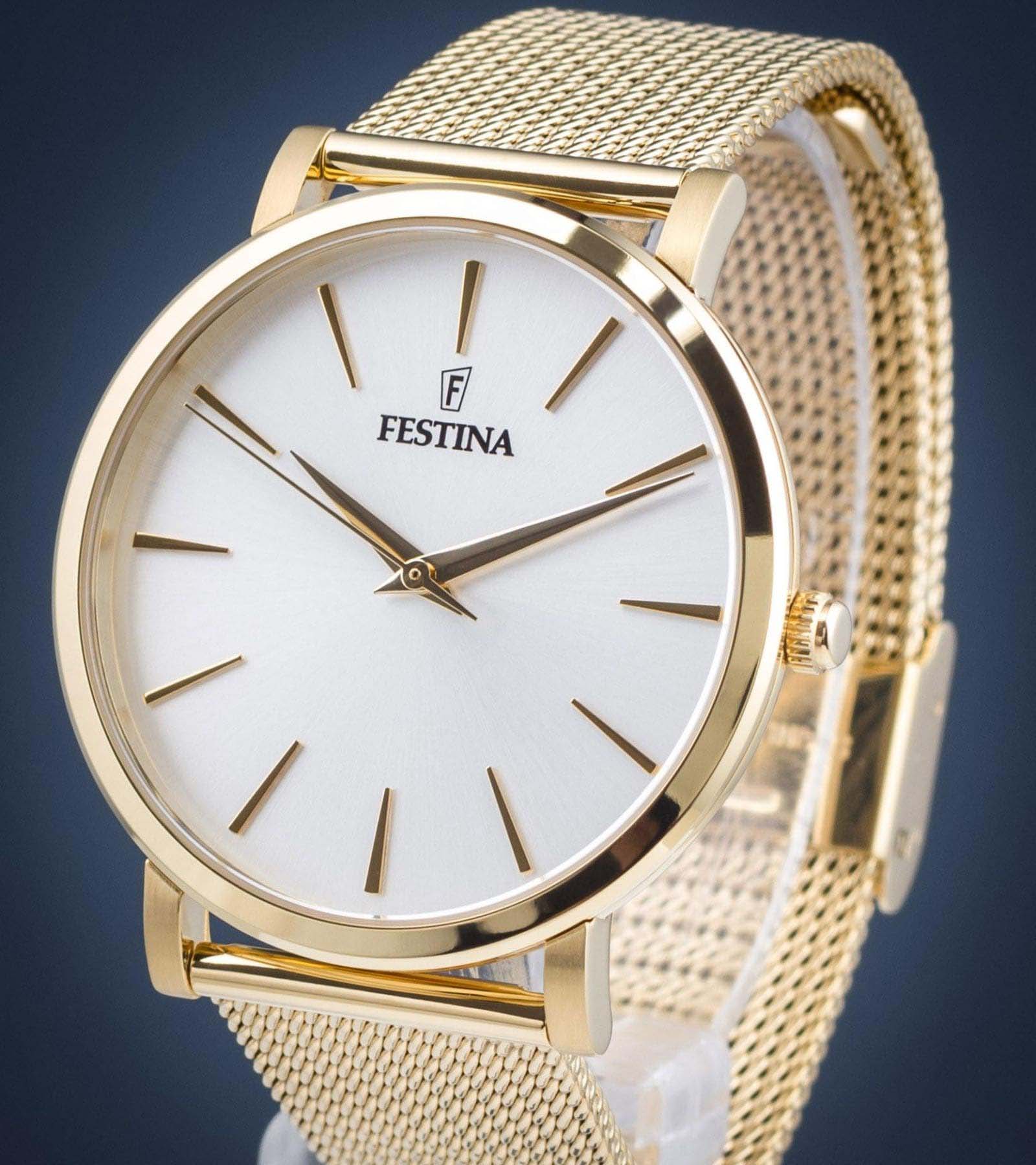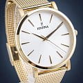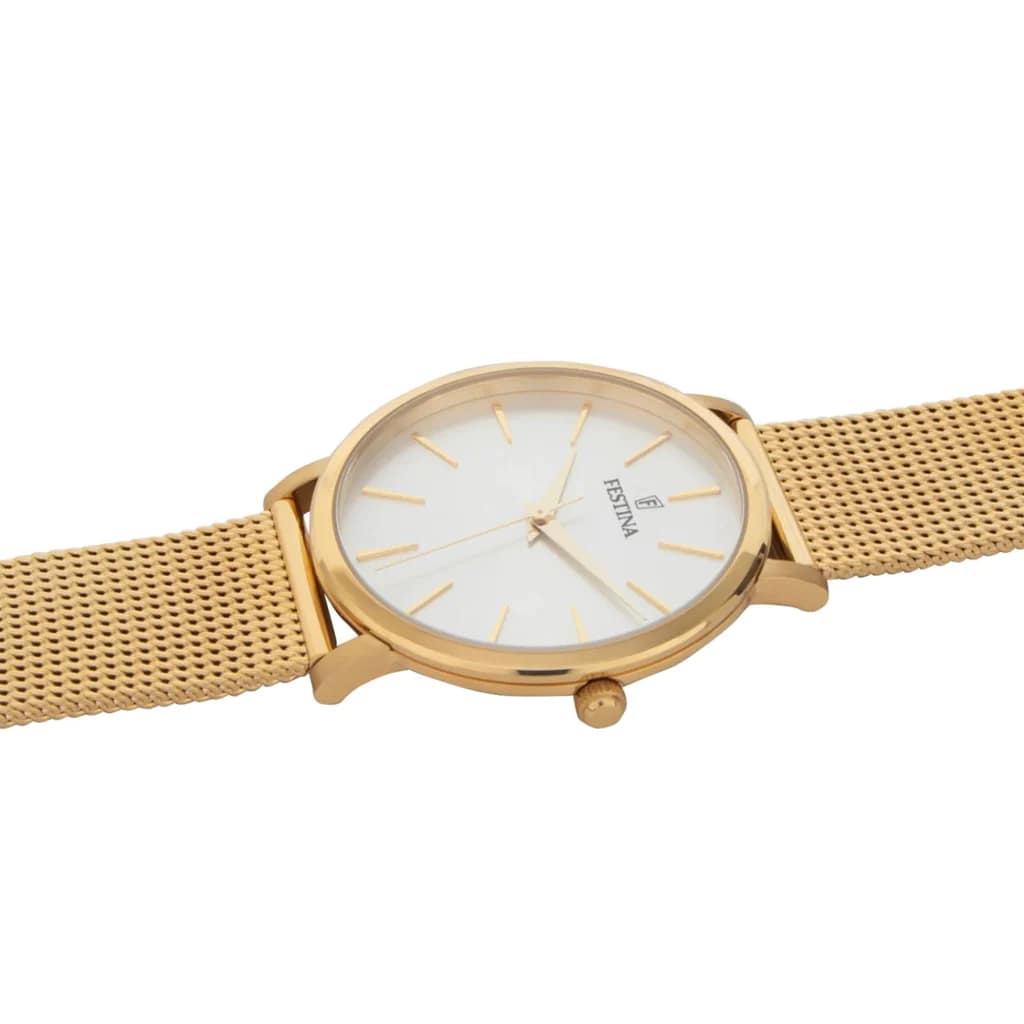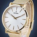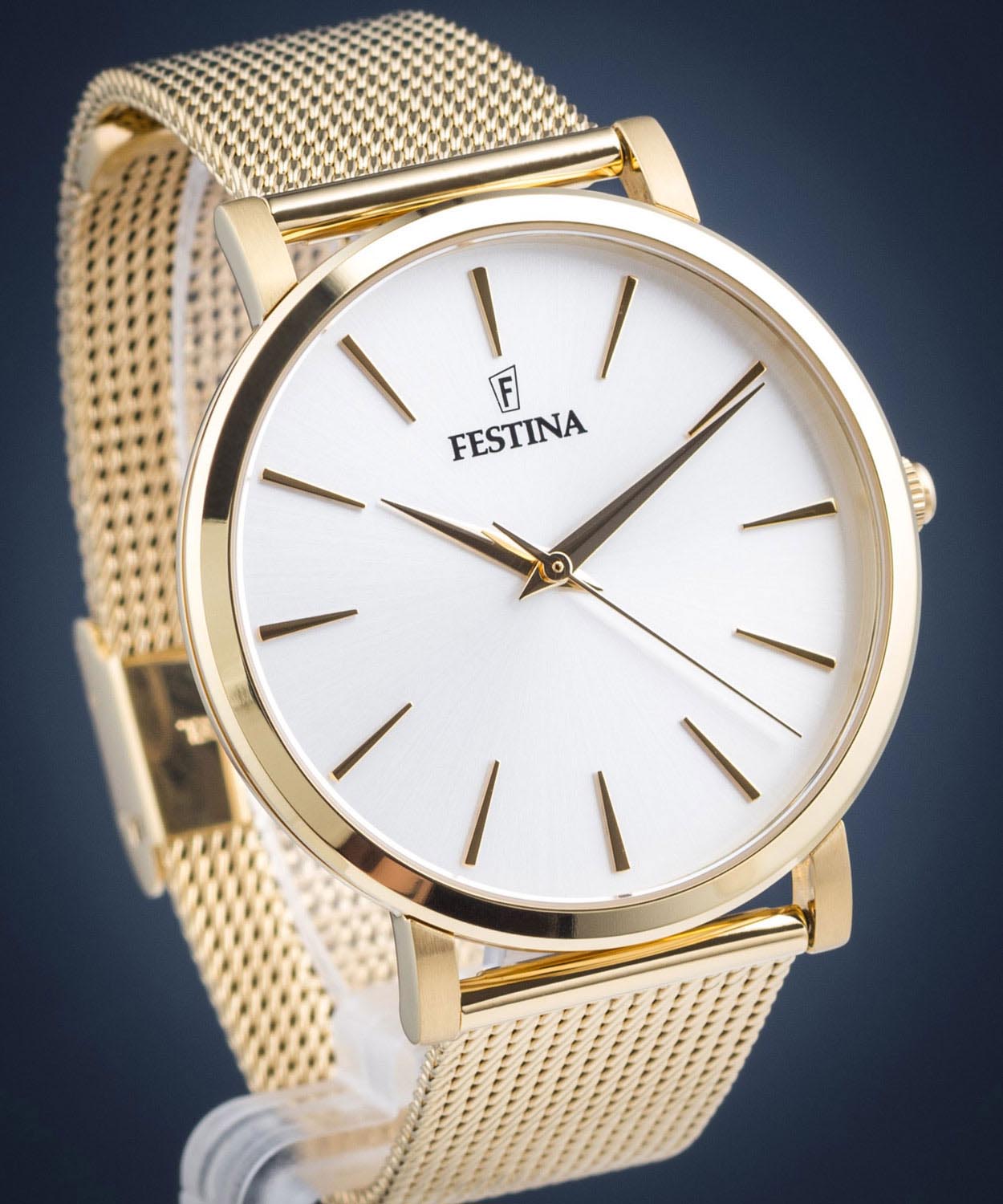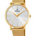 Женские кварцевые часы с минеральным стекломМинеральное стеклоМинеральное стекло представляет собой искусственно выращенный минерал кварца. Такое стекло отличается особой устойчивостью к повреждениям и царапинам. Уступает по некоторым качествам сапфировому стеклу. Festina Boyfriend F20476/1, кварцевый механизм с высокой точностью. Класс водозащиты: 30 метров, позволит защитить корпус от случайных брызг или капель дождя. Корпус часов изготовлен из стали с PVD-покрытиемPVDУльтратонкое покрытие наносится в технике вакуумного напыления, сочетает в себе нитрид титана особой прочности со слоем золота или оксида хрома. Несёт в себе декоративную или защитную функцию.. Стальной браслет миланского плетения на раскладной застёжкеРаскладная застёжкаТакой тип застёжки используется только на браслетах из металла. Она никогда не раскрывается полностью, происходит разделение на 2 и более частей. Раскладывающая застёжка снизит вероятность потери часов к минимуму. с PVD-покрытиемPVDУльтратонкое покрытие наносится в технике вакуумного напыления, сочетает в себе нитрид титана особой прочности со слоем золота или оксида хрома. Несёт в себе декоративную или защитную функцию..