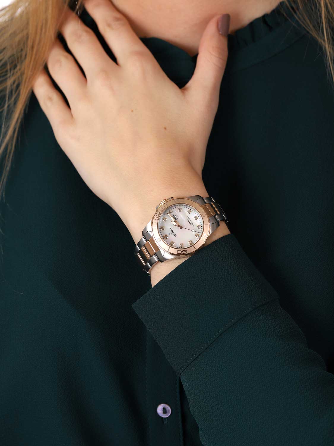 Яркий стиль и функциональность этих часов придутся по душе активной девушке. Кварцевый механизм с высокой точностью. Минеральное стеклоМинеральное стеклоМинеральное стекло представляет собой искусственно выращенный минерал кварца. Такое стекло отличается особой устойчивостью к повреждениям и царапинам. Уступает по некоторым качествам сапфировому стеклу. устойчивое к появлению царапин, обладающее высокой прозрачностью. Циферблат выполнен по технологии Sunray (солнечные лучи). Класс водозащиты: 100 метров, позволит плавать, нырять и заниматься другими водными видами спорта. Корпус часов изготовлен из нержавеющей стали. БезельБезельВнешний ободок, закрепляющий стекло. В спортивных часах так называется поворотное кольцо с делениями на циферблате, выполняет роль таймера – замеряет отрезки времени на шкале. Неподвижный безель – элемент декора. Однонаправленно вращающийся безель на дайверских часах позволяет фиксировать моменты погружения и выныривания на поверхность. c IP-покрытиемIP-покрытиеМетод ионного напыления. Демонстрирует повышенную устойчивость к истиранию, окислению и химическим веществам. Под воздействием высокого давления и температуры около 1500°C молекулы металла надёжно соединяются с частицами корпуса часов.. Браслет с частичным IP-покрытиемIP-покрытиеМетод ионного напыления. Демонстрирует повышенную устойчивость к истиранию, окислению и химическим веществам. Под воздействием высокого давления и температуры около 1500°C молекулы металла надёжно соединяются с частицами корпуса часов. и с раскладной застёжкойРаскладная застёжкаТакой тип застёжки используется только на браслетах из металла. Она никогда не раскрывается полностью, происходит разделение на 2 и более частей. Раскладывающая застёжка снизит вероятность потери часов к минимуму..