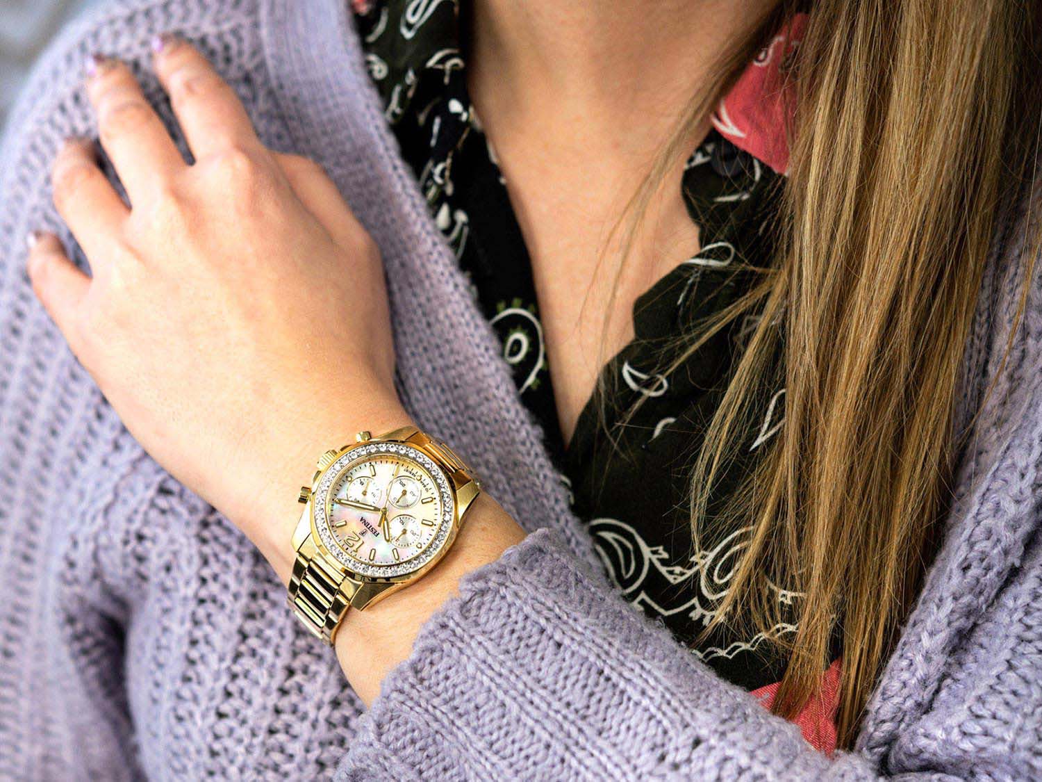 Яркий стиль и функциональность этих часов придутся по душе активной девушке. Часы-хронографХронографФункция позволяет измерять отрезки времени с особой точностью: часы, минуты, секунды. Верным признаком хронографа является наличие на циферблате 3 дополнительных окошек-счётчиков.. Кварцевый механизм с высокой точностью. Минеральное стеклоМинеральное стеклоМинеральное стекло представляет собой искусственно выращенный минерал кварца. Такое стекло отличается особой устойчивостью к повреждениям и царапинам. Уступает по некоторым качествам сапфировому стеклу. устойчивое к появлению царапин, обладающее высокой прозрачностью. Перламутровый циферблат. Стрелки и метки с люминесцентным покрытиемЛюминесцентное покрытиеПозволяет считывать показания времени в темноте. Производители наносят на стрелки, часовые индексы, безель или поверхность циферблата светонакопительный состав, дающий холодное свечение.. БезельБезельВнешний ободок, закрепляющий стекло. В спортивных часах так называется поворотное кольцо с делениями на циферблате, выполняет роль таймера – замеряет отрезки времени на шкале. Неподвижный безель – элемент декора. Однонаправленно вращающийся безель на дайверских часах позволяет фиксировать моменты погружения и выныривания на поверхность. с PVD-покрытиемPVDУльтратонкое покрытие наносится в технике вакуумного напыления, сочетает в себе нитрид титана особой прочности со слоем золота или оксида хрома. Несёт в себе декоративную или защитную функцию. украшенный кристаллами. Класс водозащиты: 100 метров, позволит плавать, нырять и заниматься другими водными видами спорта. Корпус часов изготовлен из нержавеющей стали. Браслет с PVD-покрытиемPVDУльтратонкое покрытие наносится в технике вакуумного напыления, сочетает в себе нитрид титана особой прочности со слоем золота или оксида хрома. Несёт в себе декоративную или защитную функцию. и с раскладной застёжкойРаскладная застёжкаТакой тип застёжки используется только на браслетах из металла. Она никогда не раскрывается полностью, происходит разделение на 2 и более частей. Раскладывающая застёжка снизит вероятность потери часов к минимуму..