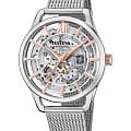 Женские механические часы-скелетоны Festina Automatic F20627/1, механический механизм (автоматический калибр) с высокой точностью. Сапфировое стеклоСапфировое стеклоПрочный и надёжный материал из кристалла сапфира синтетического происхождения, характеризующийся особой твёрдостью и устойчивостью к царапинам и повреждениям. устойчивое к появлению царапин, обладающее высокой прозрачностью. Класс водозащиты: 30 метров, позволит защитить корпус от случайных брызг или капель дождя. Корпус часов изготовлен из стали. Стальной браслет на раскладной застёжкеРаскладная застёжкаТакой тип застёжки используется только на браслетах из металла. Она никогда не раскрывается полностью, происходит разделение на 2 и более частей. Раскладывающая застёжка снизит вероятность потери часов к минимуму.. Циферблат с метками в виде штрихов и римской цифры 12. Рифленая заводная головка.