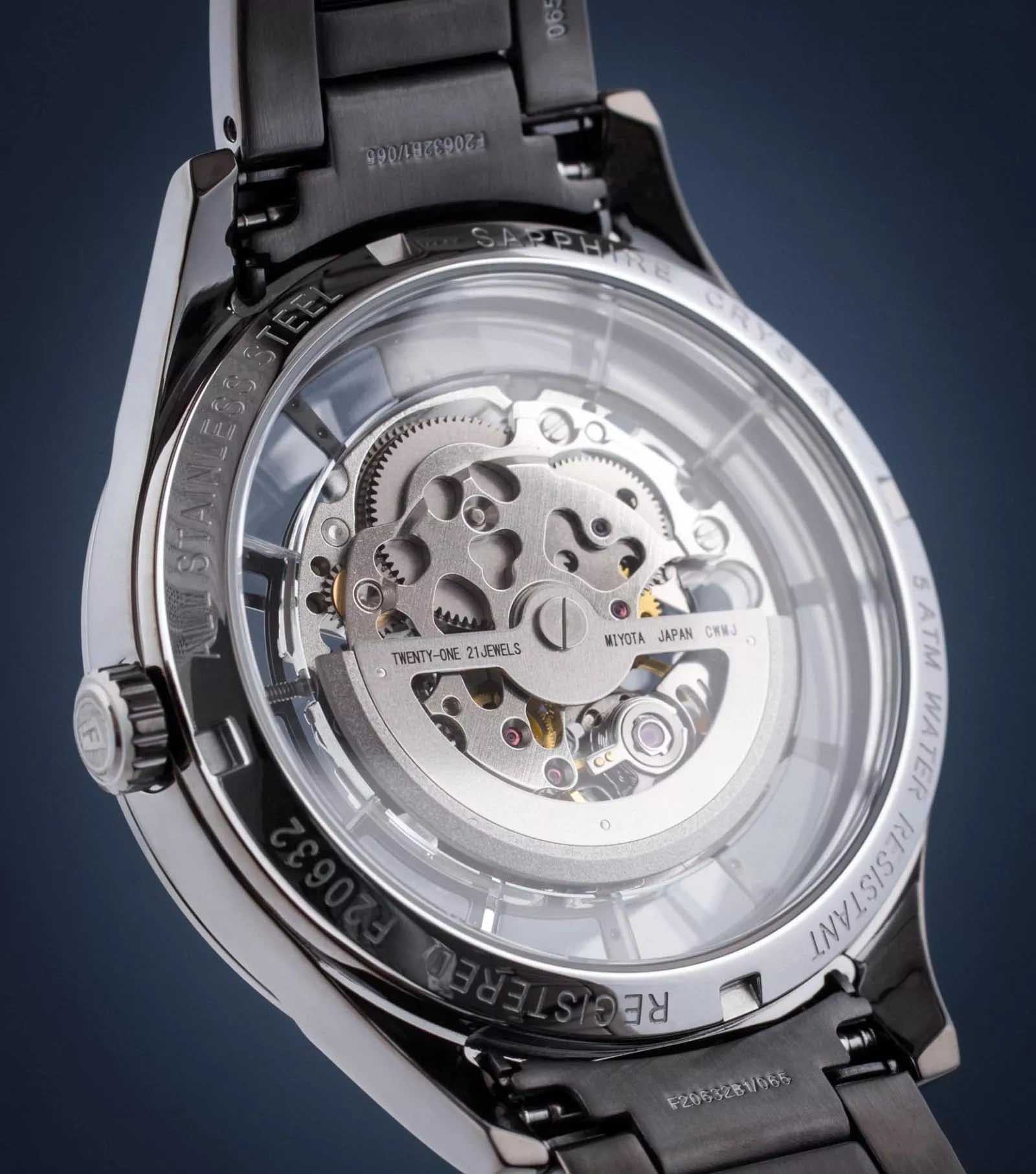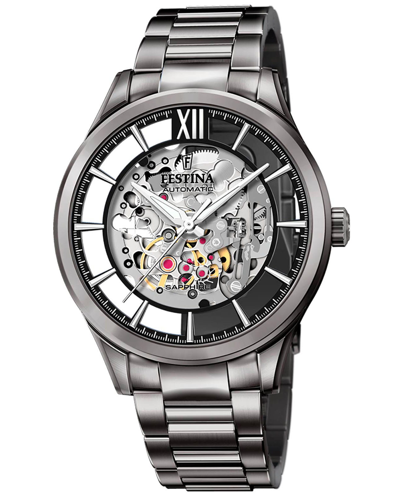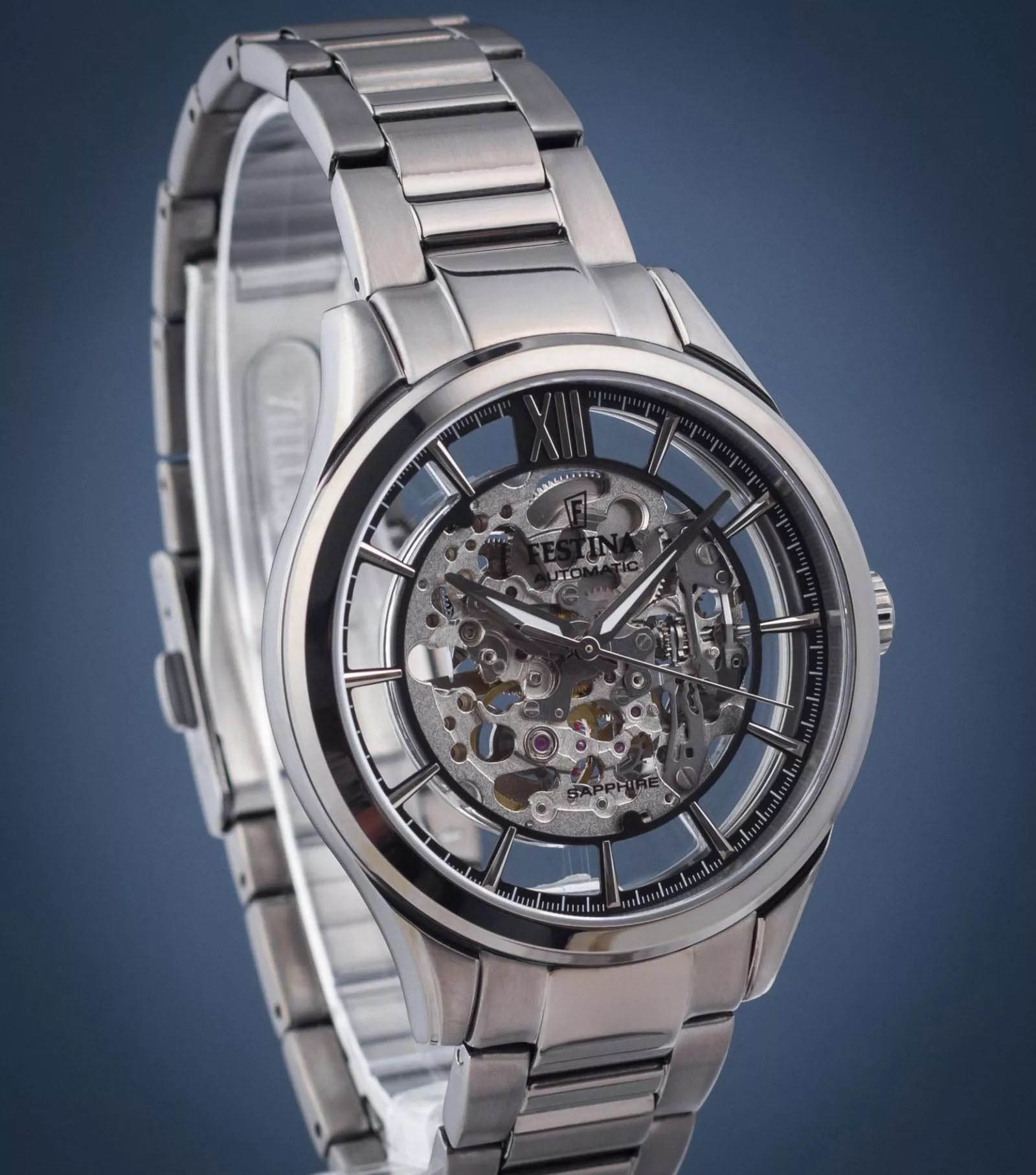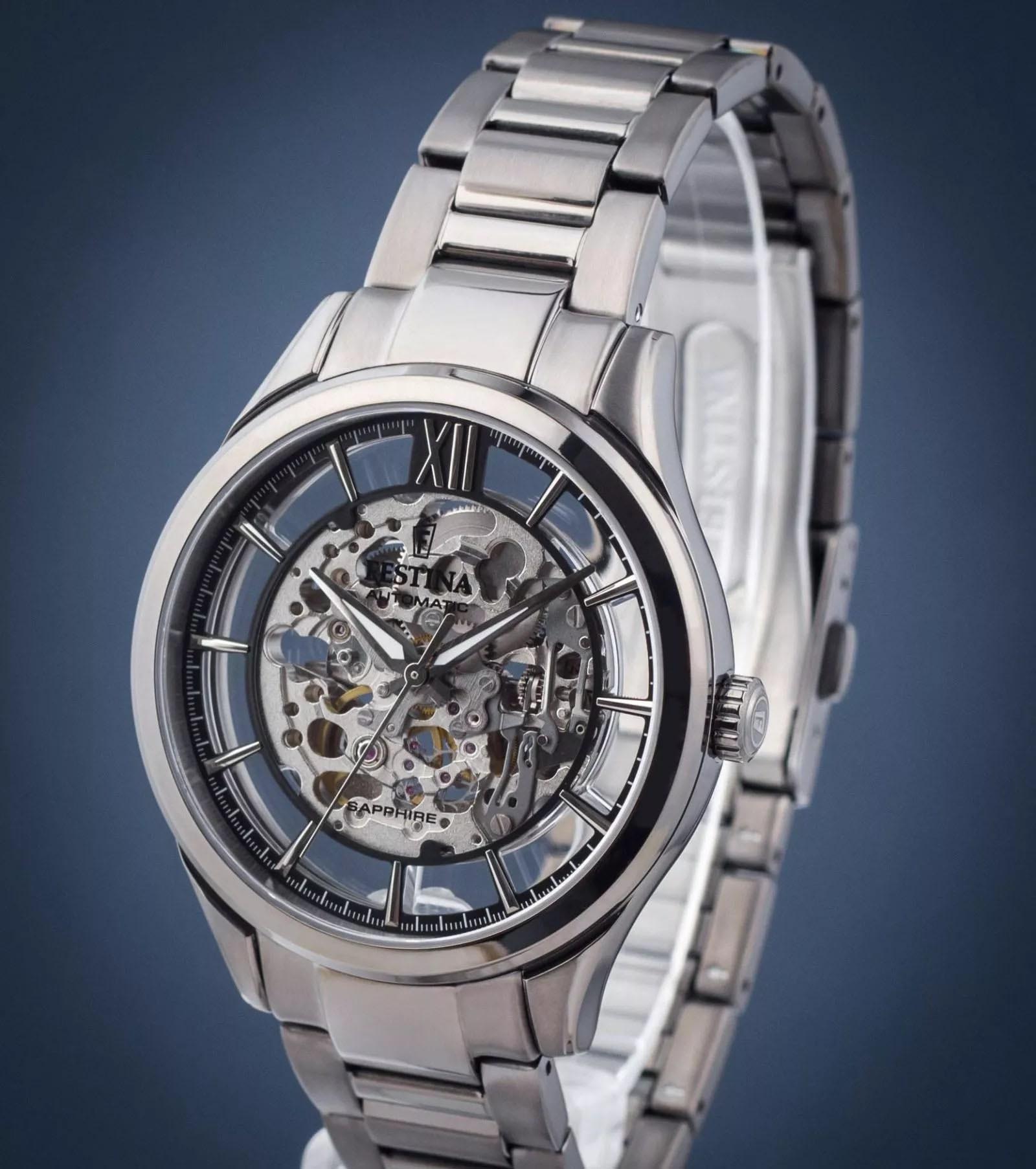 Мужские механические часы-скелетоны Festina Automatic F20632/1, механический механизм (автоматический калибр) с высокой точностью. Сапфировое стеклоСапфировое стеклоПрочный и надёжный материал из кристалла сапфира синтетического происхождения, характеризующийся особой твёрдостью и устойчивостью к царапинам и повреждениям. устойчивое к появлению царапин, обладающее высокой прозрачностью. Класс водозащиты: 50 метров, позволит защитить корпус от случайных брызг или капель дождя. Корпус часов изготовлен из стали с PVD-покрытиемPVDУльтратонкое покрытие наносится в технике вакуумного напыления, сочетает в себе нитрид титана особой прочности со слоем золота или оксида хрома. Несёт в себе декоративную или защитную функцию.. Стальной браслет на раскладной застёжкеРаскладная застёжкаТакой тип застёжки используется только на браслетах из металла. Она никогда не раскрывается полностью, происходит разделение на 2 и более частей. Раскладывающая застёжка снизит вероятность потери часов к минимуму. с PVD-покрытиемPVDУльтратонкое покрытие наносится в технике вакуумного напыления, сочетает в себе нитрид титана особой прочности со слоем золота или оксида хрома. Несёт в себе декоративную или защитную функцию.. Циферблат с метками в виде штрихов и римской цифры 12. Рифленая заводная головка. Стрелки и метки с люминесцентным покрытиемЛюминесцентное покрытиеПозволяет считывать показания времени в темноте. Производители наносят на стрелки, часовые индексы, безель или поверхность циферблата светонакопительный состав, дающий холодное свечение..