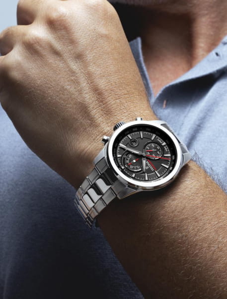 Кварцевый механизм с высокой точностью c хронографомХронографФункция позволяет измерять отрезки времени с особой точностью: часы, минуты, секунды. Верным признаком хронографа является наличие на циферблате 3 дополнительных окошек-счётчиков.. Минеральное стеклоМинеральное стеклоМинеральное стекло представляет собой искусственно выращенный минерал кварца. Такое стекло отличается особой устойчивостью к повреждениям и царапинам. Уступает по некоторым качествам сапфировому стеклу. устойчивое к появлению царапин, обладающее высокой прозрачностью. Класс водозащиты: 100 метров, позволит плавать, нырять и заниматься другими водными видами спорта. Корпус часов изготовлен из нержавеющей стали. Браслет из стали с раскладной застёжкойРаскладная застёжкаТакой тип застёжки используется только на браслетах из металла. Она никогда не раскрывается полностью, происходит разделение на 2 и более частей. Раскладывающая застёжка снизит вероятность потери часов к минимуму.. Стрелки и метки с люминесцентным покрытиемЛюминесцентное покрытиеПозволяет считывать показания времени в темноте. Производители наносят на стрелки, часовые индексы, безель или поверхность циферблата светонакопительный состав, дающий холодное свечение..