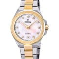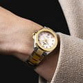 Эти часы представляют собой гармоничное сочетание элегантности и практичности, что делает их идеальным выбором для любой представительницы прекрасного пола. Часы оснащены высокоточным кварцевым механизмом, обеспечивающим надёжную работу. Минеральное стеклоМинеральное стеклоМинеральное стекло представляет собой искусственно выращенный минерал кварца. Такое стекло отличается особой устойчивостью к повреждениям и царапинам. Уступает по некоторым качествам сапфировому стеклу., обладающее высокой устойчивостью к царапинам и обеспечивающее отличную прозрачность, защищает корпус часов от повреждений. Класс водозащиты составляет 50 метров, что гарантирует защиту корпуса от случайных капель дождя. Корпус часов выполнен из нержавеющей стали, что обеспечивает долговечность и прочность. Браслет также изготовлен из стали с частичным PVD-покрытиемPVDУльтратонкое покрытие наносится в технике вакуумного напыления, сочетает в себе нитрид титана особой прочности со слоем золота или оксида хрома. Несёт в себе декоративную или защитную функцию., которое придаёт ему дополнительную прочность и блеск. Раскладная застёжкаРаскладная застёжкаТакой тип застёжки используется только на браслетах из металла. Она никогда не раскрывается полностью, происходит разделение на 2 и более частей. Раскладывающая застёжка снизит вероятность потери часов к минимуму. обеспечивает удобство использования. БезельБезельВнешний ободок, закрепляющий стекло. В спортивных часах так называется поворотное кольцо с делениями на циферблате, выполняет роль таймера – замеряет отрезки времени на шкале. Неподвижный безель – элемент декора. Однонаправленно вращающийся безель на дайверских часах позволяет фиксировать моменты погружения и выныривания на поверхность. часов часов также покрыт PVD-покрытиемPVDУльтратонкое покрытие наносится в технике вакуумного напыления, сочетает в себе нитрид титана особой прочности со слоем золота или оксида хрома. Несёт в себе декоративную или защитную функцию., что придаёт часам завершённый вид.