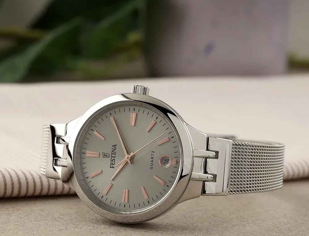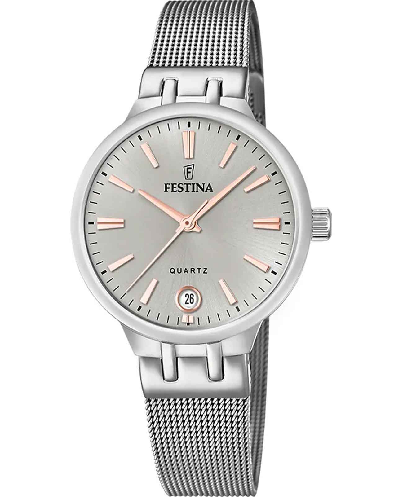 Часы Festina Mademoiselle F20712/1 для женщин представляют собой гармоничное сочетание современного стиля и функциональности. Эти часы имеют корпус из нержавеющей стали серебристого цвета шириной 33 мм, который придает изделию элегантный и утонченный вид. Серебристый циферблат защищен сапфировым стекломСапфировое стеклоПрочный и надёжный материал из кристалла сапфира синтетического происхождения, характеризующийся особой твёрдостью и устойчивостью к царапинам и повреждениям., что гарантирует устойчивость к царапинам и долговечность. Функция отображения даты, расположенная на отметке «6 часов», добавляет практичности и удобства в использовании.  Водонепроницаемость на глубине до 50 метров обеспечивает защиту от незначительных брызг, делая эти часы надежными в повседневном использовании. Браслет из нержавеющей стали в миланском плетении с раскладным замкомРаскладной замокДанный вариант застежки используется только на часах с металлическим браслетом. Отличительная особенность такого крепления в том, что длина браслета становится универсальной и вы можете самостоятельно отрегулировать нужный вам размер – застежка просто двигается по браслету часов. также выполнен в серебристом цвете и прекрасно дополняет общий дизайн, создавая цельный и привлекательный образ.