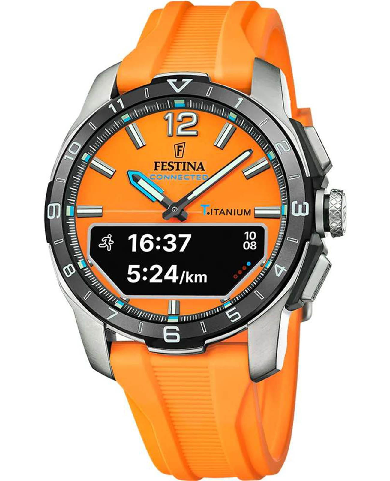 Мужские гибридные умные часы Festina Connected D — это современный аксессуар, сочетающий классический аналоговый дизайн и передовые технологии. Корпус диаметром 44 мм выполнен из лёгкого титана. БезельБезельВнешний ободок, закрепляющий стекло. В спортивных часах так называется поворотное кольцо с делениями на циферблате, выполняет роль таймера – замеряет отрезки времени на шкале. Неподвижный безель – элемент декора. Однонаправленно вращающийся безель на дайверских часах позволяет фиксировать моменты погружения и выныривания на поверхность. с IP-покрытиемIP-покрытиеМетод ионного напыления. Демонстрирует повышенную устойчивость к истиранию, окислению и химическим веществам. Под воздействием высокого давления и температуры около 1500°C молекулы металла надёжно соединяются с частицами корпуса часов.. Циферблат оранжевого цвета оформлен штрихами и стрелками. В центре циферблата расположен небольшой OLED-дисплей для отображения цифровой информации. Циферблат защищён сапфировым стекломСапфировое стеклоПрочный и надёжный материал из кристалла сапфира синтетического происхождения, характеризующийся особой твёрдостью и устойчивостью к царапинам и повреждениям.. Часы оснащены функциями BluetoothBluetoothСовременная технология, позволяющая синхронизировать часы с телефоном и переносить данные. Часы с Bluetooth расширяют возможности вашего смартфона и делают его использование ещё более удобным., мирового времениМировое время Полезное часовое усложнение, отображающее время в основных городах и известных областях по всему миру, оно связано с часовыми поясами, удобно для путешественников и бизнесменов. , будильника, таймера обратного отсчёта, секундомера, а также уведомлений о звонках, сообщениях и напоминаниях. Стрелки и метки с люминесцентным покрытиемЛюминесцентное покрытиеПозволяет считывать показания времени в темноте. Производители наносят на стрелки, часовые индексы, безель или поверхность циферблата светонакопительный состав, дающий холодное свечение. обеспечивают читаемость в темноте. Часы оснащены силиконовым ремешком оранжевого цвета на стандартной пряжке. Водонепроницаемость 30 м позволяет использовать часы в повседневных условиях. Идеальный выбор для тех, кто ценит стиль, точность и интеллектуальные функции.